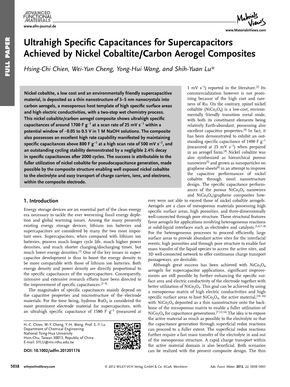 比容量的大小主要取决于电极材料的电容性质和微结构。目前,含水RuO2被认为是超级电容器最突出的电极材料,文献报道超高比容量为1580 F g-1(在1 mV s-1下测量)。[2]然而,由于Ru的高成本和稀有性,其商业化并不乐观。相反,尖晶石型钴酸锂(NiCo2O4)是一种低成本、环保的过渡金属氧化物,其组成元素相对丰富,具有优异的电容性能。[4]实际上,已经证明当以气凝胶形式制备时,具有优异的比容量1400 F g-1(在25 mV s-1下测量)。[4]钴酸锂也被合成为分层多孔纳米线[5],并在石墨烯片上作为纳米颗粒生长[6],试图通过新颖的纳米结构设计来改善钴酸锂的电容性能。然而,多孔NiCo2O4纳米线和NiCo2O4 /石墨烯复合材料的比容量不能超过钴酸锂气凝胶的比容量。气凝胶是一类具有高比表面积,高孔隙率和通过孔结构三维连接的中孔材料。这些结构特征有利于气凝胶用于涉及固体-液体界面如电极和催化剂的异质反应的应用。[3,4,7-9]为了有效地进行异质过程,需要大表面积以提供用于界面反应的丰富活性位点,高孔隙率和通孔结构以使快速3D良好连接的网络能够提供连续的电荷传输通道。