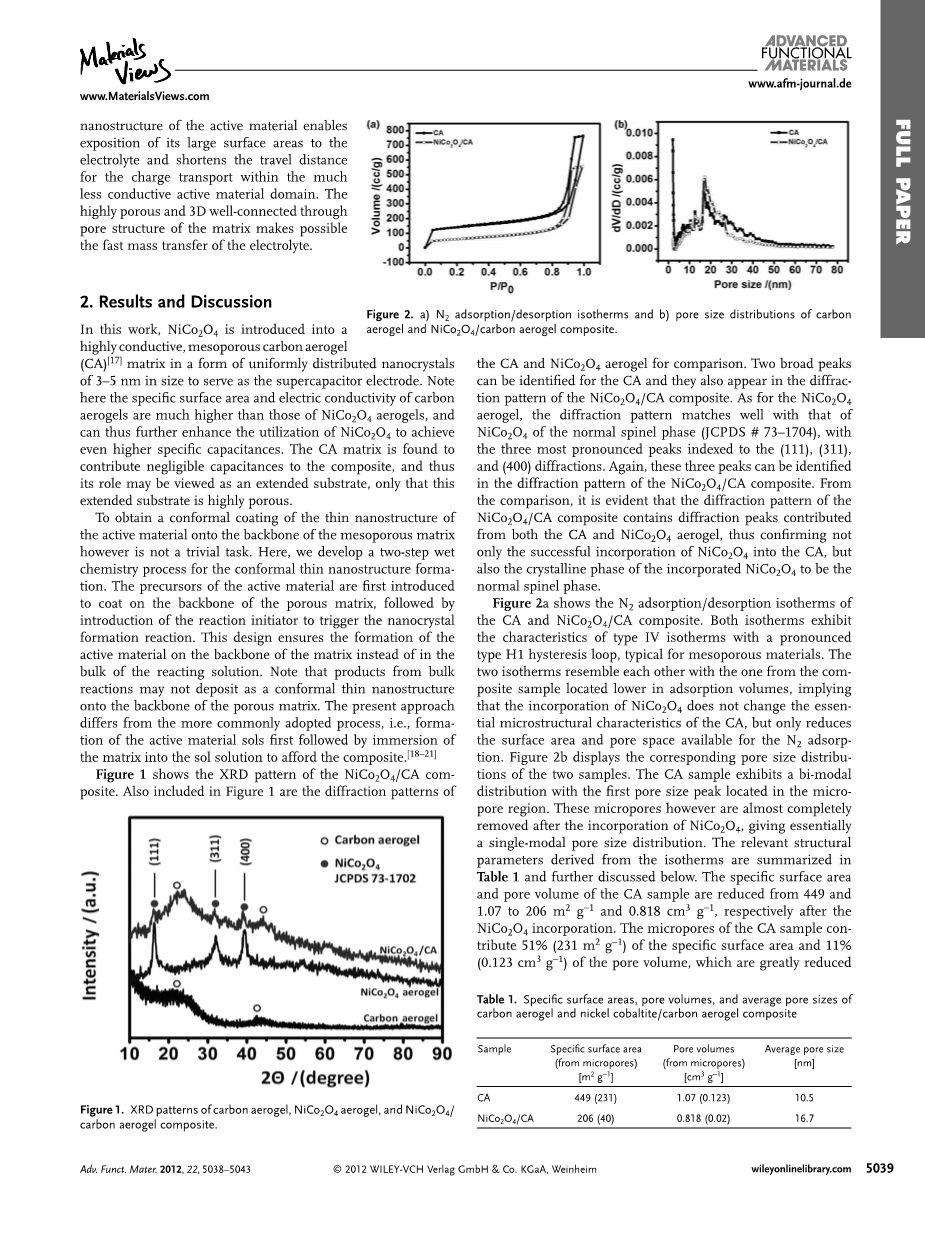尽管NiCo2O4气凝胶用于超级电容器应用取得了巨大成功,但通过进一步提高电极的比表面积和电导率以及更好地利用NiCo2O4,仍然可以实现显着的改进。这一目标可以通过使用高电导率和高比表面积的介孔基质来承载活性材料NiCo2O4, [10-16]其中NiCo2O4作为薄纳米结构沉积到介孔基质的骨架上以使得NiCo2O4在电容中的应用更充分。[7,12,16]这个想法是尽可能将活性材料暴露于电解质中,以便通过表面氧化还原反应产生的电容可以更充分地发展。表面氧化还原反应还需要电解质快速传质进出中孔结构。活性材料域内的快速电荷传输也是有益的。这两种情况都可以通过目前的复合设计来实现。活性材料的薄纳米结构使其能够将其大表面积暴露于电解质,并缩短了在导电性较低的活性材料域内电荷传输的移动距离。基质的高孔隙度和3D良好连接的孔结构使得电解质的快速传质成为可能。
