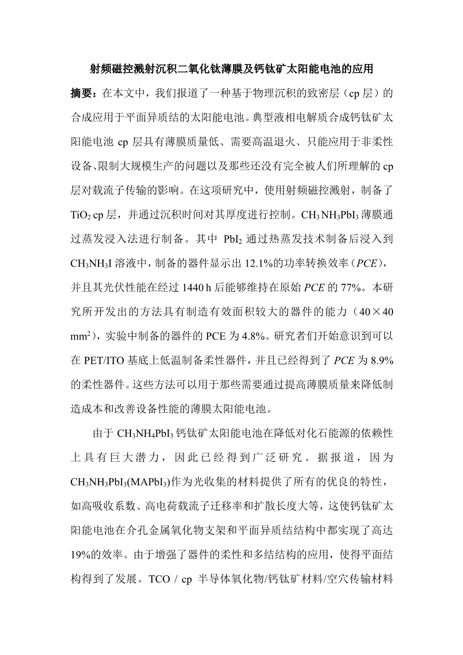 柔性钙钛矿太阳能电池中TiO2电子传输层的低温制备外文翻译资料