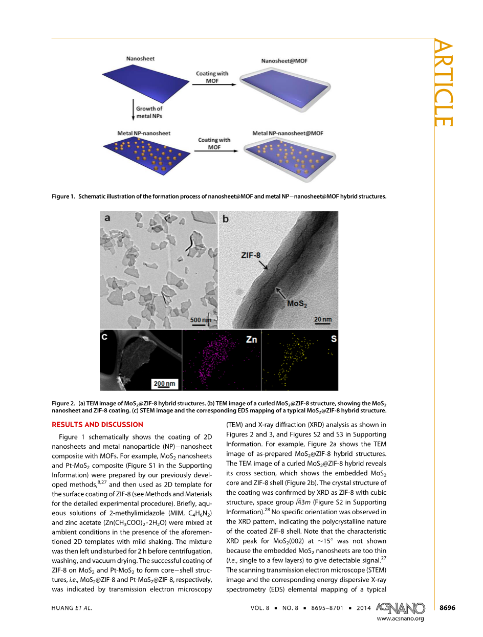 Figure1示意性地显示了MOFs包覆的二维纳米片和金属纳米粒子(NP)-纳米片复合物。例如,MoS2纳米片和Pt-MoS2 复合物(支撑信息中的Figure S1)通过我们先前开发的方法制备得到,8, 27然后用作ZIF-8的表面包覆的二维模板(详细的实验过程参见方法和材料部分)。简而言之,2-甲基咪唑(MIM,C4H6N2)和醋酸锌 (Zn(CH3COO)2·2H2O)的水溶液和上述的二维模板在常温常压下通过温润的搅拌进行混合。混合物先静置2小时,接着进行离心,洗涤和真空干燥等步骤。成功制备的ZIF-8包覆MoS2和ZIF-8包覆Pt-MoS2分别构造了MoS2@ZIF-8和Pt-MoS2@ZIF-8核壳结构。核壳结构通过透射电子显微镜(TEM)和X射线衍射(XRD)表征分析的验证,相关结果展示在Figure 2和3,也包括支撑信息中的Figure S2和S3。例如,Figure 2a展示了所制备的MoS2@ZIF-8杂化结构的TEM图像。卷曲的MoS2@ZIF-8混合物的TEM图像显示了MoS2@ZIF-8的横截面,包括了嵌入的MoS2核和ZIF-8壳(Figure 2b)。包覆物的晶体结构的XRD分析结果表明包覆物为ZIF-8,呈现为立方结构,空间群为I-43m(支撑信息中的Figure S2)。28XRD图像中没有观察到晶体择优取向,表明包覆的ZIF-8壳是多晶的。值得注意的是,在~15°的MoS2(002)XRD特征峰没有出现在XRD图像中是因为植入的MoS2纳米片的厚度非常薄(仅有少数几层)而不能给出检测信号。27MoS2@ZIF-8的典型结构的扫描电子显微镜(SEM)图像和相应的能量色散X射线光谱(EDS)元素分布显示出均匀分布的Zn和S元素(Figure 2c)。