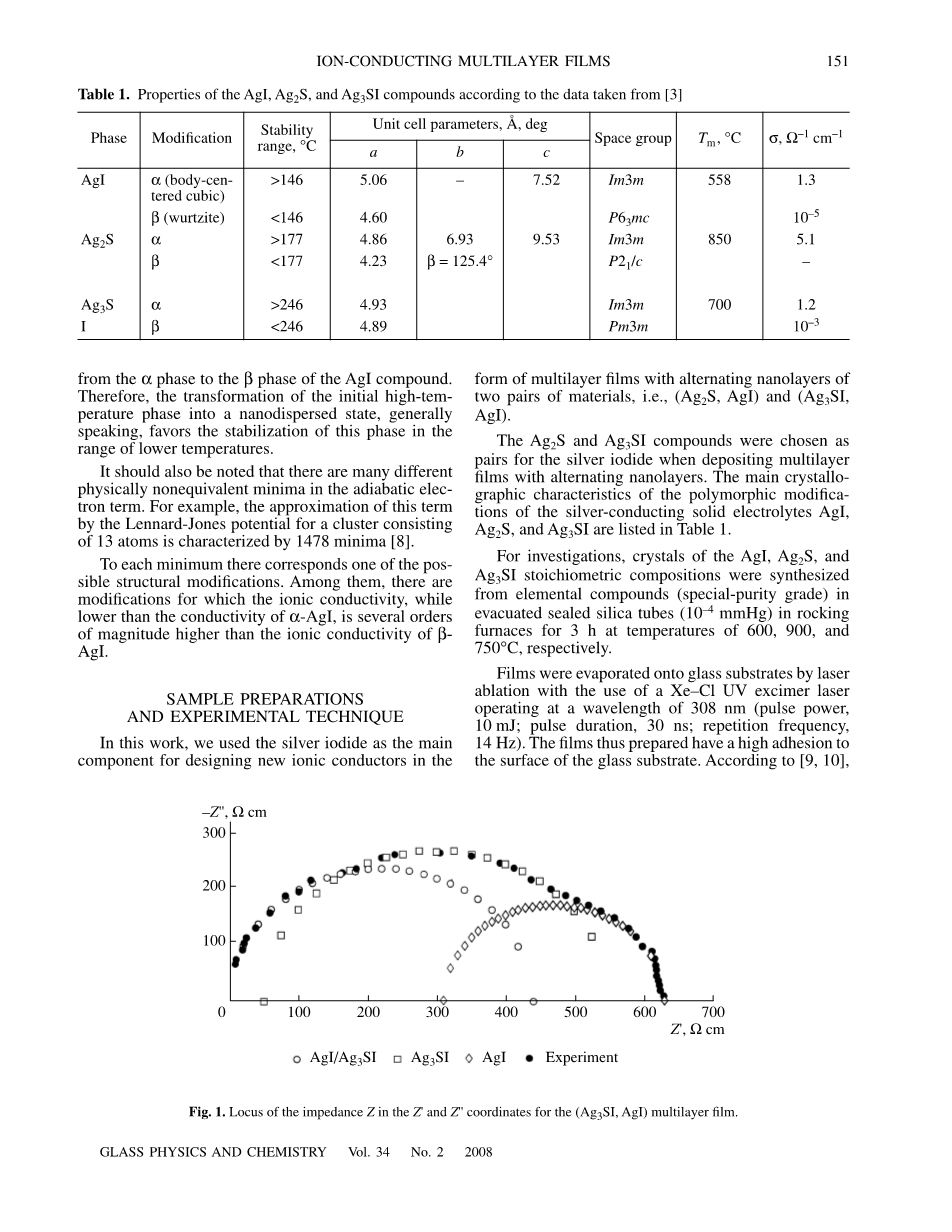 为了测量数据,将Ag3SI与AgI或Ag2S与AgI这一对化合物在玻璃基板上准备好。每组薄膜样品包含30个交替层(每个化合物拥有15层),并且厚度相同。除此之外,还有一层由Ag3SI或Ag2S的化合物组成的层被堆积在薄膜的顶部。前两类薄膜的总长度约为1.2micro;m和0.8micro;m。多层膜的阻抗是沿着交替层测量的。最后,银电极通过真空蒸发作用在薄膜上。