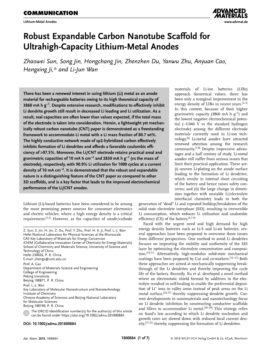 由于其高达3860mA h g-1的理论容量,锂(Li)金属被用于可充电电池的负极材料已经引起了新的兴趣。尽管进行了广泛的研究,但有效抑制Li枝晶生长的改进仍导致Li负载和Li利用率降低。可实验结果表明,如果考虑电极的总质量,实际容量通常低于预期值。在此,轻质但机械强度高的碳纳米管(CNT)纸被证明是一种独立的框架,以容纳Li质量分数为80.7wt%的Li金属。由sp2杂化碳制成的高导电网络有效抑制Li枝晶的形成,并提供gt; 97.5%的有效库仑效率。此外,Li/CNT电极在电流密度为10 mA cm-2时分别保持10 mAh cm-2和2830 mAh g-1(相对于电极质量)的实际面积和重量容量,利用率为90.9%,持续1000次循环。已经证明,与其他3D支架相比,坚固且可扩展的性质是CNT纸的区别特征,并且是致使Li/CNT负极电化学性能改善的的关键因素。