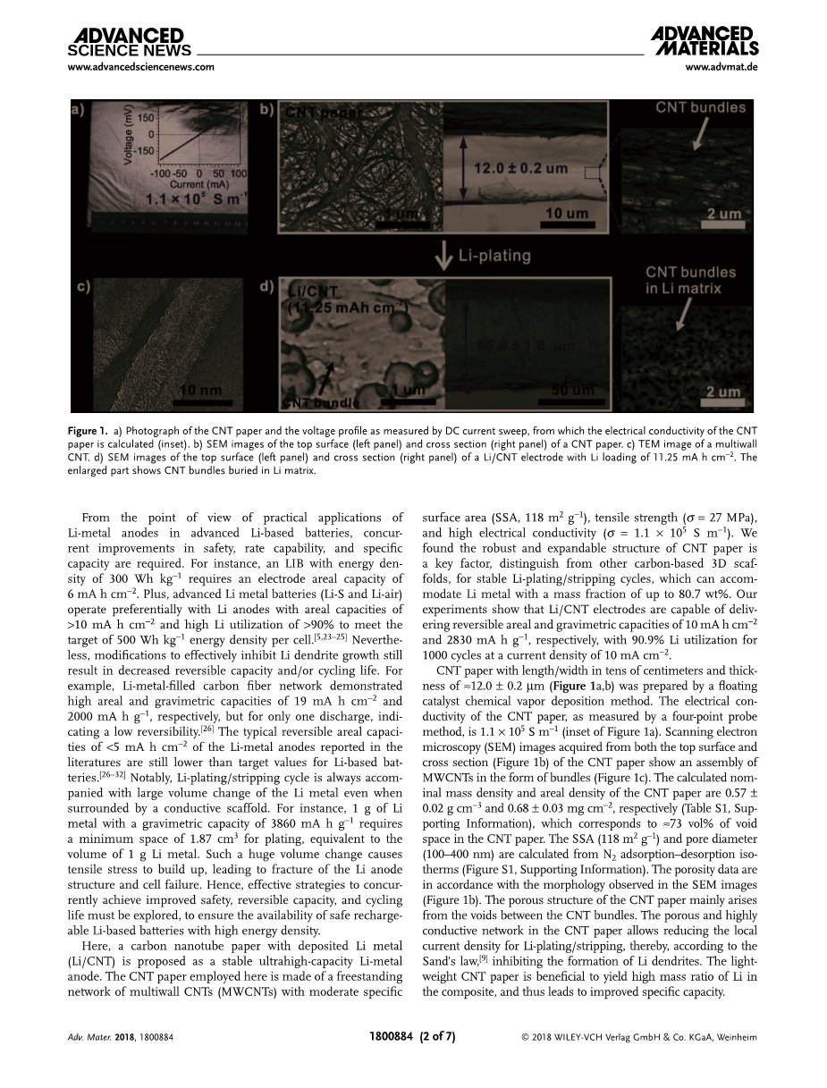 通过浮动催化化学气相沉积法制备长度/宽度为几十厘米且厚度为约12.0plusmn;0.2mu;m的CNT纸(图1a,b)。通过四点探针法测量的CNT纸的电导率为1.1times;105 S m-1(图1a的插图)。从CNT纸的顶部表面和横截面(图1b)获得的扫描电子显微镜(SEM)图像显示了束形式的MWCNT的组装(图1c)。 CNT纸的计算标称质量密度和面密度分别为0.57plusmn;0.02g cm -3和0.68plusmn;0.03mg cm -2(表S1,支持信息),其对应于asymp;73vol%的空隙空间。 CNT纸,从N2吸附 - 解吸等温线计算SSA(118m 2 g-1)和孔径(100-400nm)(图S1,支持信息)。孔隙度数据与SEM图像中观察到的形态一致(图1b)。 CNT纸的多孔结构主要来自CNT束之间的空隙。CNT纸中的多孔且高导电性网络允许降低镀锂/剥离的局部电流密度,因此,根据Sand定律,抑制Li枝晶的形成,轻质CNT纸有利于在复合材料中产生高质量比的Li,因此导致改进的比容量。