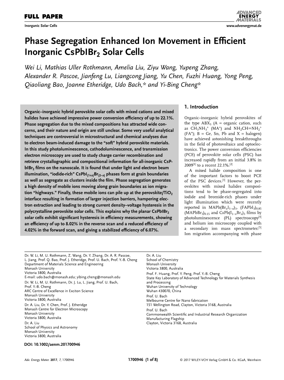 有机-无机杂化钙钛矿太阳能电池与混合阳离子和混合卤化物已达到令人印象深刻的功率转换效率22.1%。由于混合成分引起的相分离引起了广泛关注,其性质和起源仍不清楚。因为电子束对杂化钙钛矿材料的损伤,一些非常有用的分析技术在微观结构和化学分析中存在争议。本研究采用光致发光、阴极发光和透射电子显微镜研究了纳米尺度上全无机CsPbIBr2薄膜的载流子复合,并探索了其晶体学和成分信息。研究发现,在光束和电子束照射下, CsPbI(1 x)Br(2minus;x)碘富相在晶界形成,并在薄膜内部形成簇。相偏析产生沿晶界高密度的离子移动,成为离子迁移的'高速公路'。最后,这些移动离子可以堆积在钙钛矿/二氧化钛界面上,形成更大的注入屏障,阻碍电子提取,并导致多晶钙钛矿太阳能电池中的强电流密度-电压滞后。这就解释了为什么平板CsPbIBr2太阳能电池在效率测试中表现出显著的滞后性,在反向扫描中的效率高达8.02%,在正向扫描中的效率降低了4.02%,并使稳定的效率达到6.07%。