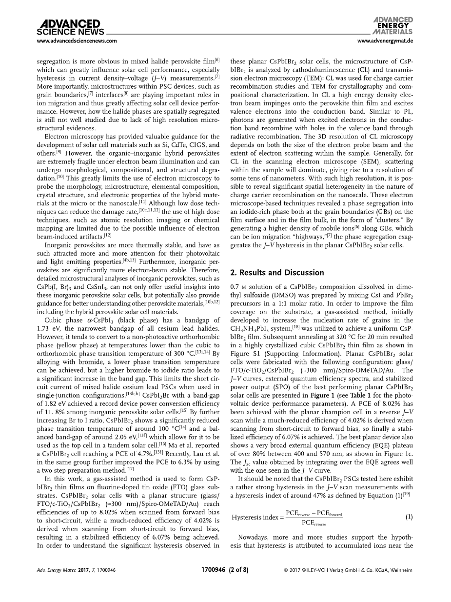 我们还计算了已公开的CsPb(I,Br)3太阳能电池的滞后指数,如表S1(支持信息)所示。通过采用类似的平板装置c-TiO2/CsPb(I,Br)3/Spiro-OMeTAD, CsPb(BrxI1minus;x)3相稳定材料,如c-TiO2和CsPbIBr2显示的滞后性指数比相不稳定的c-TiO2/(滞后指数已报告forCsPbI3[13a]25.1%,CsPbI2Br[13h]20.4%及CsPbIBr2[17]43.8%PSCs)更低。在CsPbIBr2薄膜中,无疑伴随着卤化物相分离,而且更有可能促进I-和Br-迁移,从而增强滞后性。晶界等晶界缺陷在离子迁移中也起着重要作用,因为晶界中离子迁移得到了极大的增强,并主导了J-V滞后性。因此,了解CsPbIBr2薄膜中的相如何在空间上分布是非常重要的,以便更好地了解平板CsPbIBr2太阳能电池中的强滞后性。
