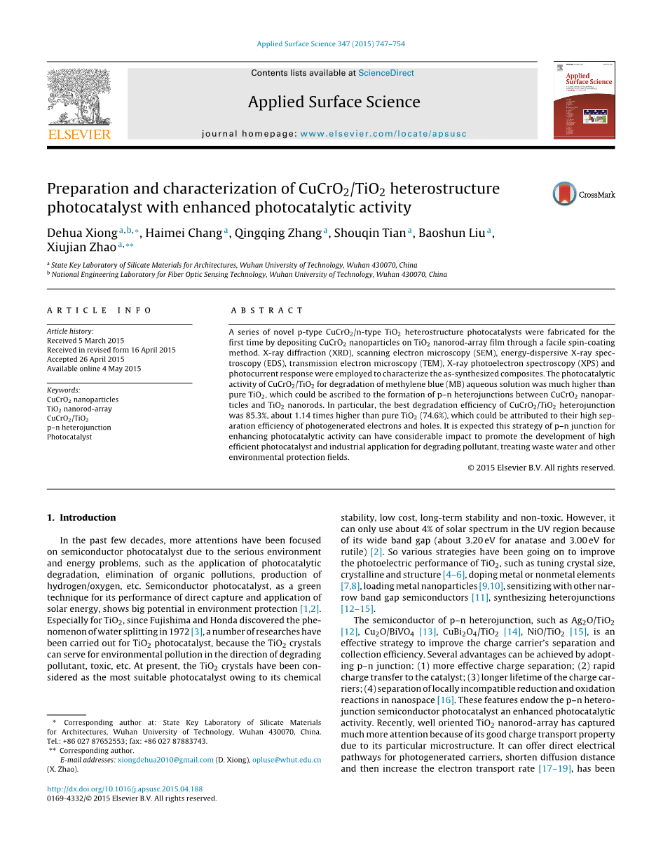 关键词:CuCrO2纳米颗粒;TiO2纳米棒阵列;CuCrO2 / TiO2;p-n异质结;光催化剂