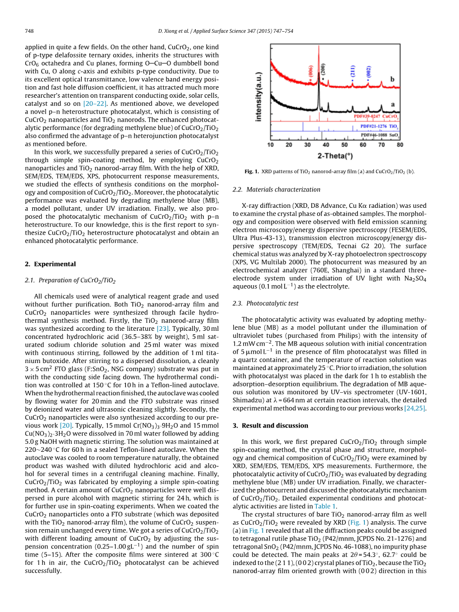 合成p-n异质结的半导体,如Ag2O/TiO2[12],Cu2O/ BiVO4[13],CuBi2O4/TiO2 [14],NiO/TiO2 [15] ,是提高载流子分离和收集效率的有效策略。采用p-n结可以实现以下几个优点:(1)更有效的电荷分离 ; (2)到催化剂的快速电荷转移; (3)载流子的寿命更长; (4)纳米空间中局部不相容的还原和氧化反应的分离[16] 。这些特征赋予p-n异质结半导体光催化剂增强的光催化活性。最近,良好取向的TiO2纳米棒阵列由于其特殊的微观结构而具有良好的电荷传输性能从而受到许多的关注。它可以为光生载流子提供直接的电通路,缩短其扩散距离,然后提高电子传输速率[17],[18],[19],已在很多领域得到应用。另一方面,CuCrO2 ,一种p型铜铁矿三元氧化物,继承了CrO6 八面体的结构和Cu的位面,沿着c轴与Cu,O 形成O -Cu -O哑铃键,并显示出p型导电性。由于其优异的光学透射率,低价带能量位置和快速空穴扩散系数,它在透明导电氧化物,太阳能电池,催化剂等方面引起了更多的研究者的关注 [20],[21],[22]。如上所述,我们开发了一种新型的由CuCrO2 纳米颗粒和TiO2纳米棒组成p-n异质结结构光催化剂。CuCrO2 / TiO2的增强的光催化性能(用于降解亚甲基蓝)也证实了如前所述的p-n异质结光催化剂的优点。