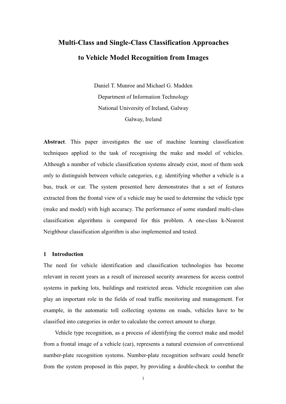 摘要: 本文研究了使用机器学习分类技术来识别车辆的构造和模型的任务。尽管已经存在多种车辆分类系统,但其中的大多数仅追求区分车辆类别,例如:识别车辆是公共汽车、卡车还是汽车。这里介绍的系统表明,从车辆正面视图中提取的一组特征可用于高精度地确定车辆类型(品牌和型号)。对于这个问题不仅比较了一些常用的多类分类算法的性能,而且一类k-最近邻分类算法也被实现和测试。