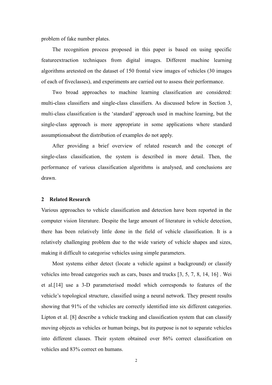 Gupte等人 [5]提出了一种在交通场景图像序列中进行车辆检测和分类的算法。该系统将车辆分为两类:轿车和非轿车(例如公共汽车、卡车、SUV)。在20分钟的公路交通顺序中,90%的车辆被正确检测和跟踪,并且这些正确跟踪的车辆中,70%识别成功。加藤等人,[7]提出开发一种驾驶辅助系统,该系统使用基于视觉的前方(与主车辆行驶方向相同的车辆)车辆识别方法,其能够根据道路环境背景识别多种车辆类型。他们使用的分类方法是多聚集修改二次判别函数。该系统将车辆分为三类,成功率为97.7%。