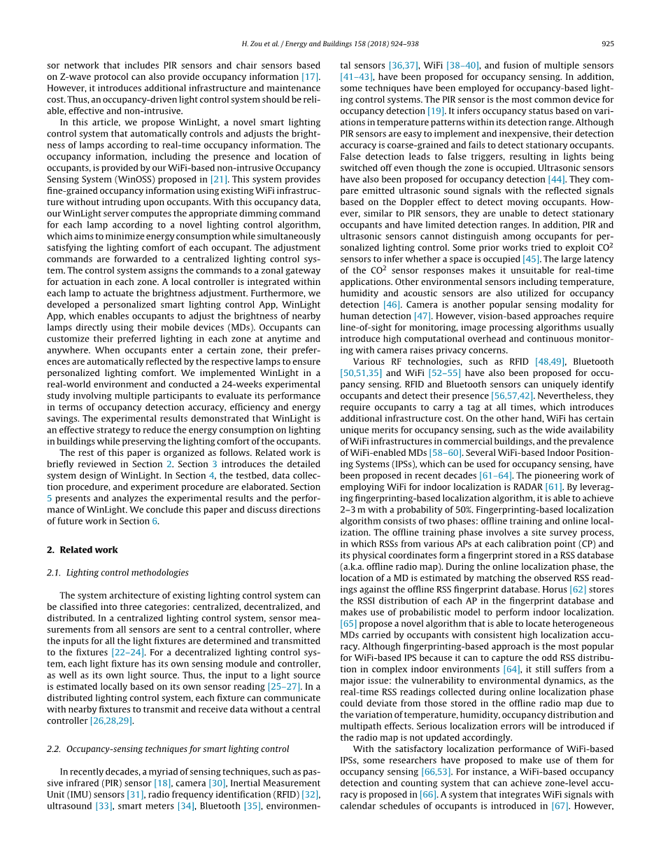 人工照明占建筑环境能源消耗的很大比例(19%)。这一巨大占比要求创建节能照明控制方案。在本文中,我们将介绍WinLight,这是一种新颖的占用感应驱动的照明控制系统,旨在降低能耗,同时保持居住者的照明舒适度。通过以非侵入的方式利用现有WiFi基础设施估计的细粒度占用信息,WinLight基于新颖的照明控制算法为每个灯计算适当的调光命令。集中照明控制系统将这些命令分配给区域网关,通过集成在每个灯内的本地控制器启动亮度调节,从而实现入住感应驱动的照明控制。此外,WinLight应用程序旨在让居住者能够定制他们的亮度偏好,并使用他们的移动设备来控制附近的灯具。我们在新加坡一个1500平方米的多功能办公室实施了WinLight系统,并在24周内进行了一项实验。实验结果表明,与静态调度照明控制方案和基于PIR传感器的照明控制方案相比,WinLight能够节省93.09%和80.27%的能源,同时保证每个居住者的个性化照明舒适度。