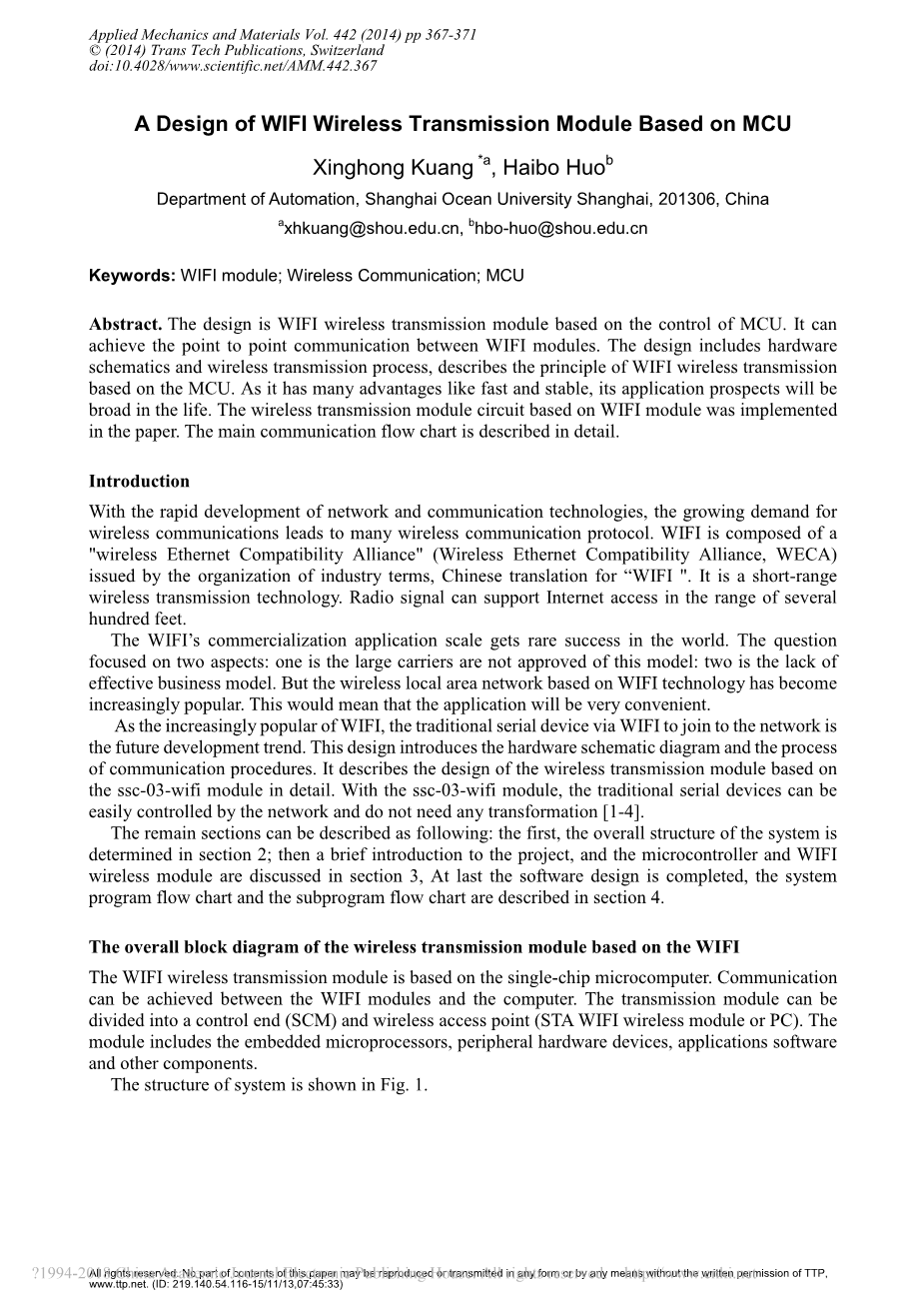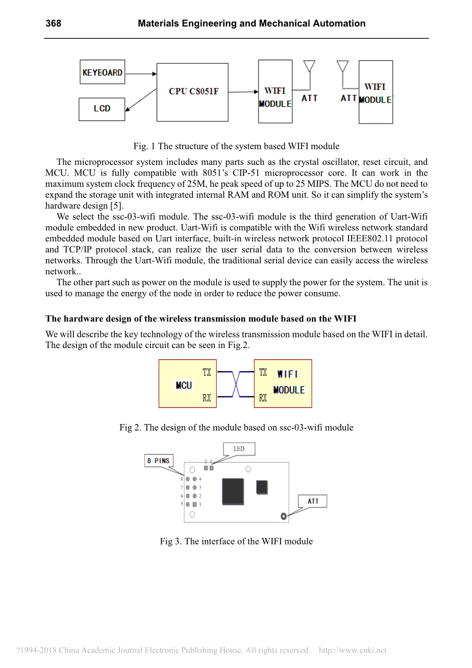 Abstract. The design is WIFI wireless transmission module based on the control of MCU. It can achieve the point to point communication between WIFI modules. The design includes hardware schematics and wireless transmission process, describes the principle of WIFI wireless transmission based on the MCU. As it has many advantages like fast and stable, its application prospects will be broad in the life. The wireless transmission module circuit based on WIFI module was implemented in the paper. The main communication flow chart is described in detail.