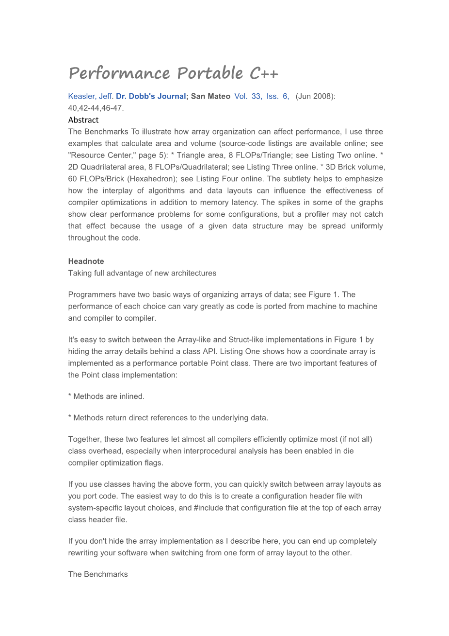 在不久的将来,性能可移植性可能成为编程的一个必要部分。如果使用跨步向量(也称为数组式布局),一些编译器就只会为x86处理器架构创建良好的SSE代码。与此同时,老式的超纯量机器通常在尽可能多地使用结构型布局时表现最好。如果没有切换内存布局的灵活性,性能几乎肯定会受到代码的影响,而当我们进入未来时,这种情况更有可能发生。
