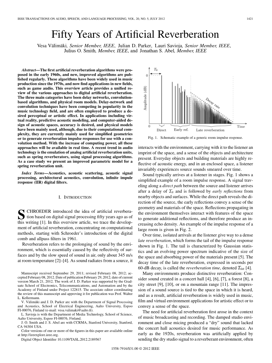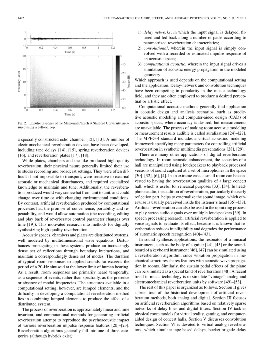 另一种避免使用FFT的方法是将卷积混响中所需的大型FIR滤波器转换为IIR系统。 以这种方式获得计算节省有几种可能性。 首先,存在将FIR滤波器转换为IIR滤波器的各种技术,例如线性预测[100],Prony方法[258],Steiglitz-McBride迭代[259]和平衡模型截断[260],[261]。 通常情况下,一个接近FIR滤波器的IIR滤波器可以用比原始FIR滤波器更少的操作数来实现。 大多数这些技术的限制是它们只能处理相当短的FIR滤波器,例如只能达到1000个系数。