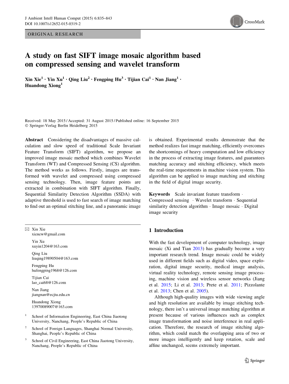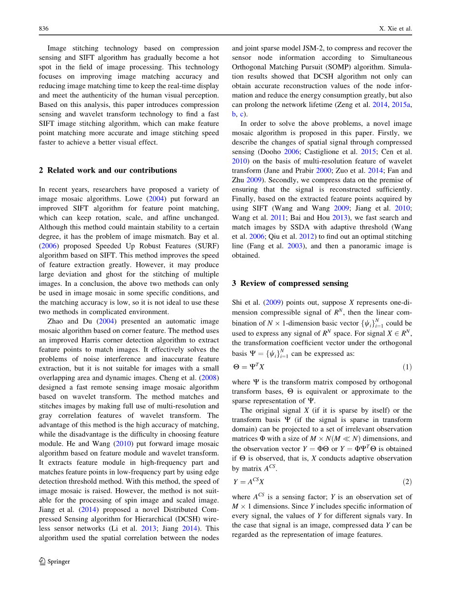 赵和杜(2004)提出了一种基于角点特征的自动图像拼接算法。该方法使用改进的哈里斯角点检测算法来提取特征点以匹配图像。它有效地解决了噪声干扰和特征提取不准确的问题,但不适用于重叠面积小,动态图像的图像。Cheng等人(2008)设计了一种基于小波变换的快速遥感图像拼接算法。该方法充分利用小波变换的多分辨率和灰度相关特征匹配和拼接图像。这种方法的优点是匹配精度高,但缺点是选择特征模块困难。他和王(2010)提出了基于特征模块和小波变换的图像拼接算法。它利用边缘检测阈值法提取高频部分的特征模块,并匹配低频部分的特征点。用这种方法,图像拼接的速度提高了。 但是,该方法不适用于旋转图像和缩放图像的处理。江等人(2014)提出了一种新的分层压缩感知算法(DCSH)无线传感器网络(李等人 2013;江2014)。该算法利用节点与联合稀疏模型JSM-2之间的空间相关性,根据同时正交匹配追踪(SOMP)算法对传感器节点信息进行压缩和恢复。仿真结果表明,DCSH算法不仅可以获得精确的节点信息重构值,大大降低能耗,而且可以延长网络寿命(Zeng et al.2014,2015a,b,c)。