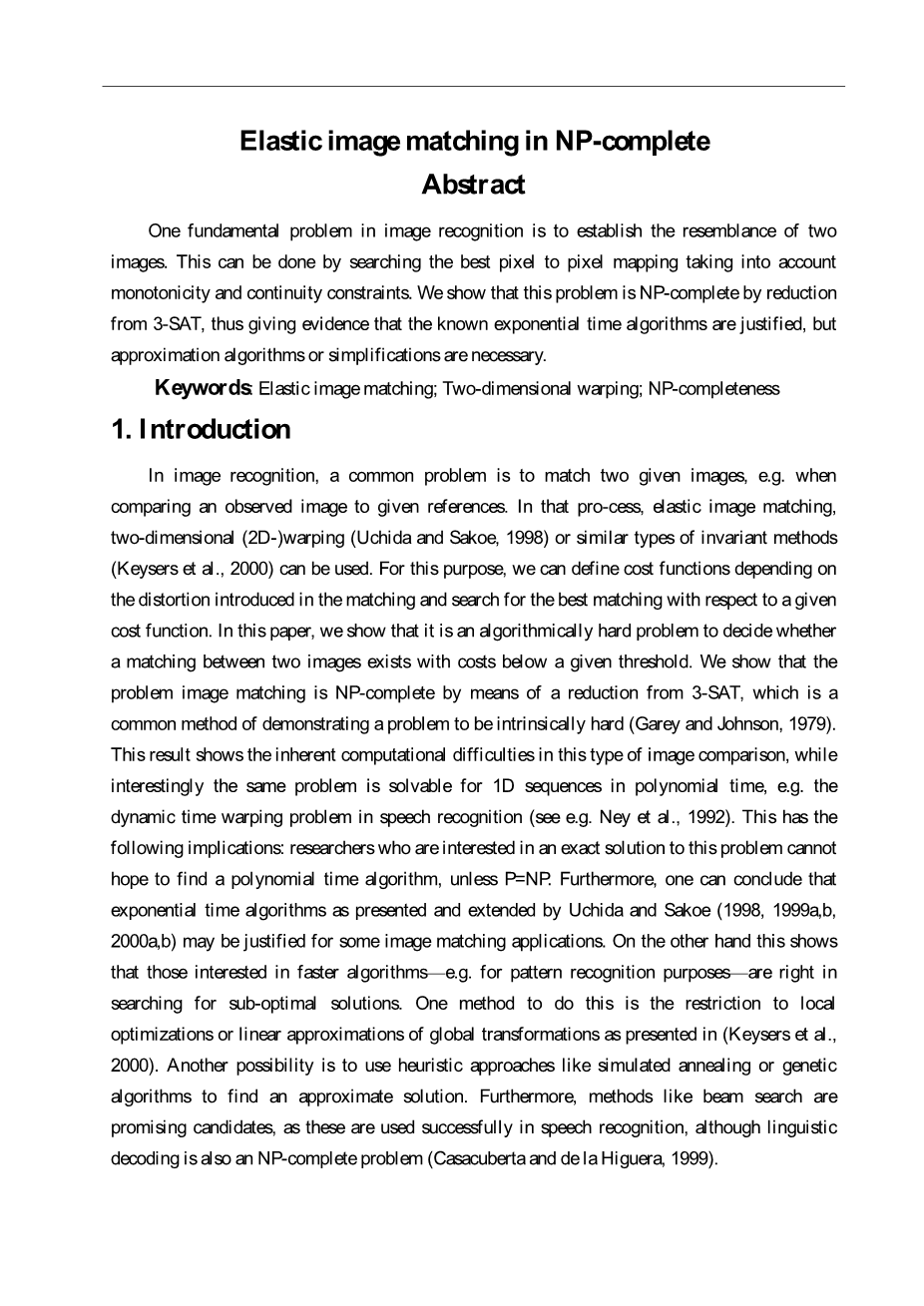 在图像识别中,一个共同的问题是匹配给定的两个图像。例如,比较观察图像,给出参考。在这个过程中,弹性图像匹配,二维翘曲或相似类型不变量方法可以运用。为此,我们可以通过在图像匹配中引入的失真定义成本函数,从而对给定成本函数搜索出最佳匹配。在本文中,我们发现决定两个匹配图像间是否存在成本低于某一阀值是一个复杂算法问题。我们还发现这个图像匹配问题是个通过从3-SAT减少的NP完全问题,这是一种常见的表明问题内在困难的方法(加里和约翰逊,1997)。这一结果表明,这种类型的图像比较存在固有的计算困难。而有趣的是,同样的问题在多项式时间算法中是可解的一维序列。例如,语音识别中的时间翘曲问题(参见例如奈伊等人,1992)。这有以下几种含义:对这一问题准确答案感兴趣的研究人员不能希望找到一个多项式时间算法,除非N=NP。此外,人们可以得出这样的结论,被内田和撒克提出并延长的指数时间算法可以认为是有正当理由的一些图像匹配应用。另一方面,这表明,对更快算法如模式识别感兴趣的人在寻找次优解决方案中是正确的。一种方法是限制凯塞斯等人2000年提出的在全球变革中的局部优化和线性近似,另一种可能性是使用启发式方法,如用模拟退火和遗传算法找到一个近似解。此外,束搜索的方法如有希望的候选人。因为这些被成功地用于语言识别,虽然语言解码也是一个NP完全问题(看瑞波特和德拉1999年提出)。
