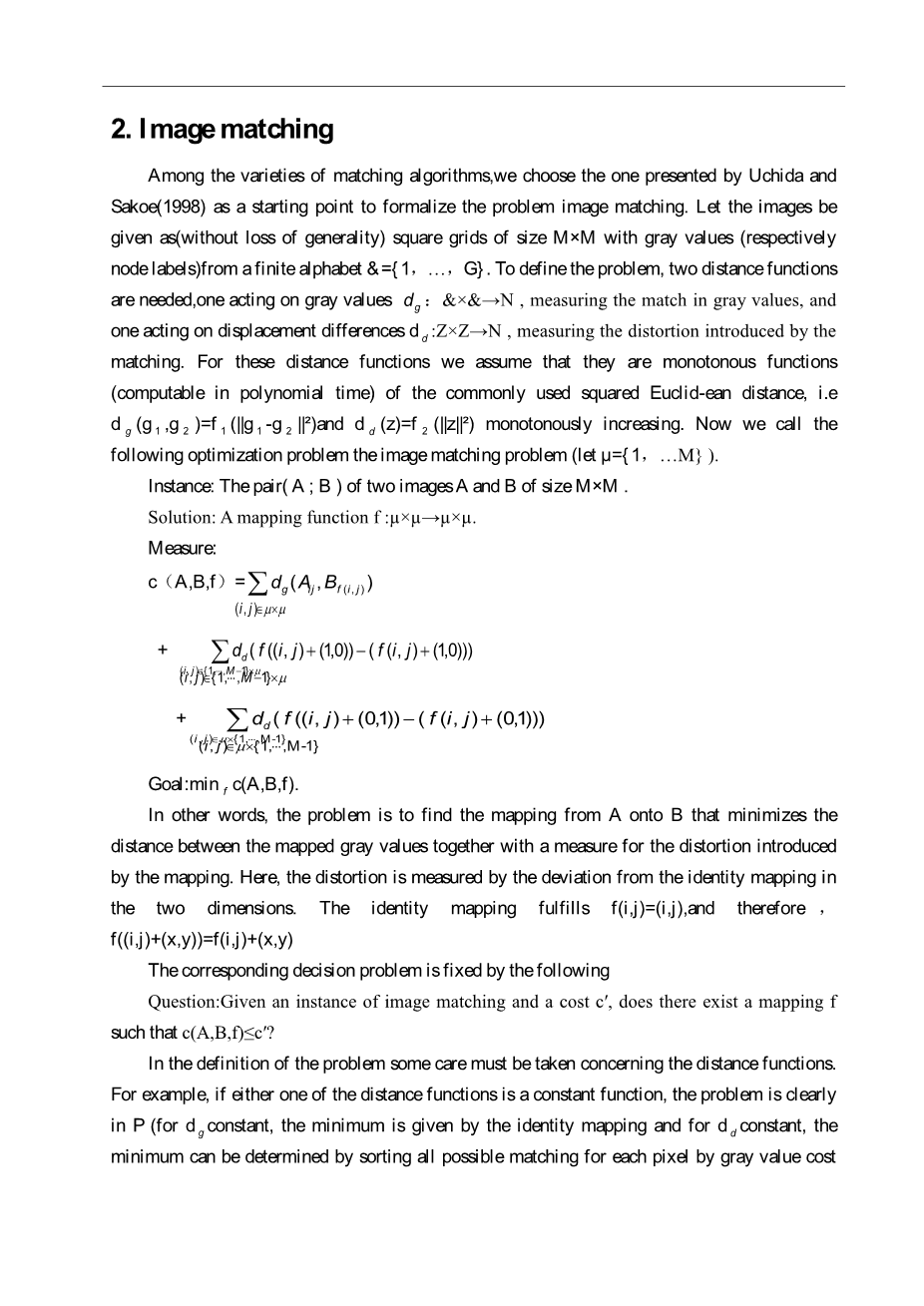 在各种各样的匹配算法中,我们选择钗达和撒克1998年提出的作为形成图像匹配的一个起点。在不丧失概括性的条件下,在一个有限字母表中让图像和分别为节点标签的灰度值作正方形网络大小的运动。为了定义这个问题,需要两个距离函数,一个相当于灰度值,,测量在灰度值中的匹配性。另一个相当于位移的差异,,测量由匹配引起的失真,对那些距离函数,我们假定它们在常用的平方距离中是可计算多项式时间的单调函数。即:随着的单调增长,且。现在我们称下面的优化问题为图像匹配问题(令)。