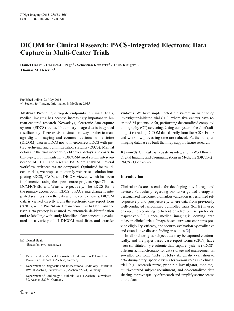 一个系统的需求分析,我们添加一个PACS节点研究,这是相互关联的EDCS和饲料e CRF。 解除DICOM的识别和重新标记数据自动完成,EDCS为用户的主要接入点。 作为概念的证明,我们仅使用开放源代码实施该系统组件。 对各种DICOM模式和传输语法进行评估,并通过正在进行的方式进行评估使用计算机筛选受试者的多中心试验体层摄影术(CT)决定将其纳入试验。