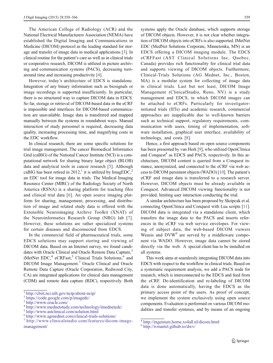 b e c,加拿大)为临床试验数据提供了丰富的功能并支持查看DICOM对象。 此外,临床试验解决方案(AG Mednet,Inc.,Boston,MA)是用于收集图像数据的模块化系统。在临床试验中。 最后但并非最不重要的是,DICOM Image管理(临床工作室,里诺,内华达州)是一项研究管理和EDCS,其中DICOM图像可以附在e CRF上。 特别是对于研究启动试验(IITs)和学术研究,商业化由于众所周知的障碍,方法不适用如技术支持,监管要求,与用户的沟通,实施时间,软件安装,图形用户界面,技术可用性和成本。