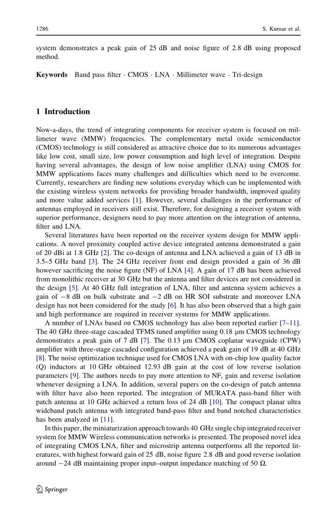 基于CMOS技术的一些LNA早些时候也有报道[7–11]。 采用0.18 lm CMOS技术的40 GHz三级级联TFMS调谐放大器的峰值增益为7 dB [7]。 具有三级级联配置的0.13微米CMOS共面波导(CPW)放大器在40 GHz时实现了19 dB的峰值增益[8]。 CMOS LNA具有片上低质量因子的噪声优化技术(Q)电感在10 GHz时获得了12.93 dB的增益,但代价很低,反向隔离参数[9]。 在设计LNA时,作者需要更多地关注NF,获得并反向隔离。 另外,也有报道了关于带滤波器的贴片天线的共同设计的几篇论文。 MURATA通带滤波器与10 GHz贴片天线的集成实现了24 dB的回波损耗[10]。 具有集成带通滤波器和带缺口特性的紧凑型平面超宽带贴片天线已在[11].