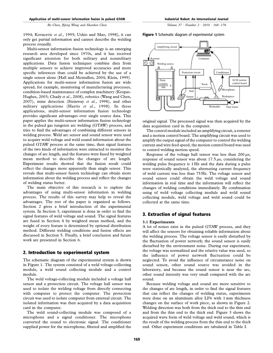 这项研究的主要目的是探索在焊接中使用多传感器信息的优点处理。这项调查的结果可能有助于揭示这个问题优点。本文的其余部分安排如下。第2节简要介绍了实验系统。在第3节中,为了找到答案,我们进行了实验焊接电压和声音的信号特征。信号特征在第4部分通过加权平均法融合,并且每个功能的重量由可选分发决定方法。不同的焊接条件和融合效果在第5节讨论。最后,简要总结和未来工作在第6节中介绍。