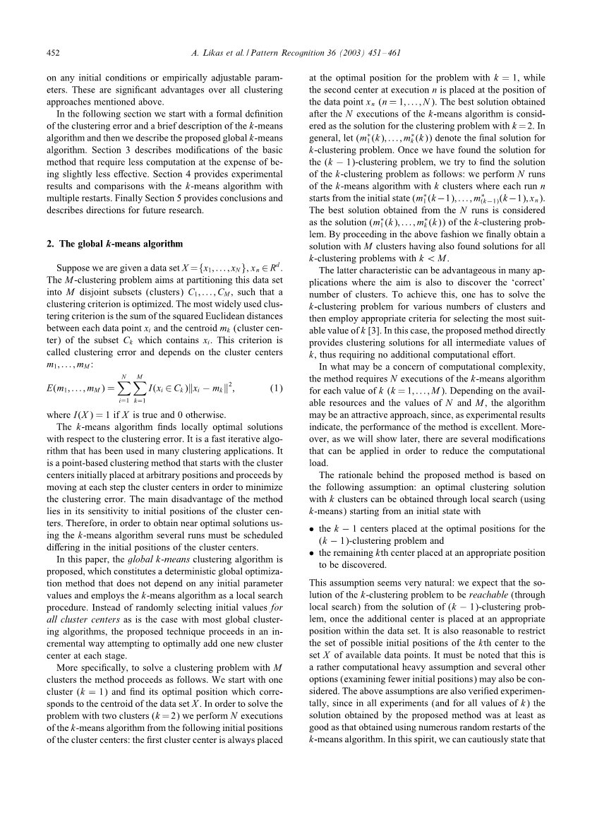 在下面的章节中,我们首先对均值聚类进行形式化定义并简要描述k均值算法,然后我们描述所提出的全局k均值算法。 第3节描述了基本方法的修改,这些修改需要较少的计算,但代价是见效甚微。 第4节提供了实验结果并与多重启动的k均值算法进行比较。最后,第5部分提供结论并描述未来研究的方向。