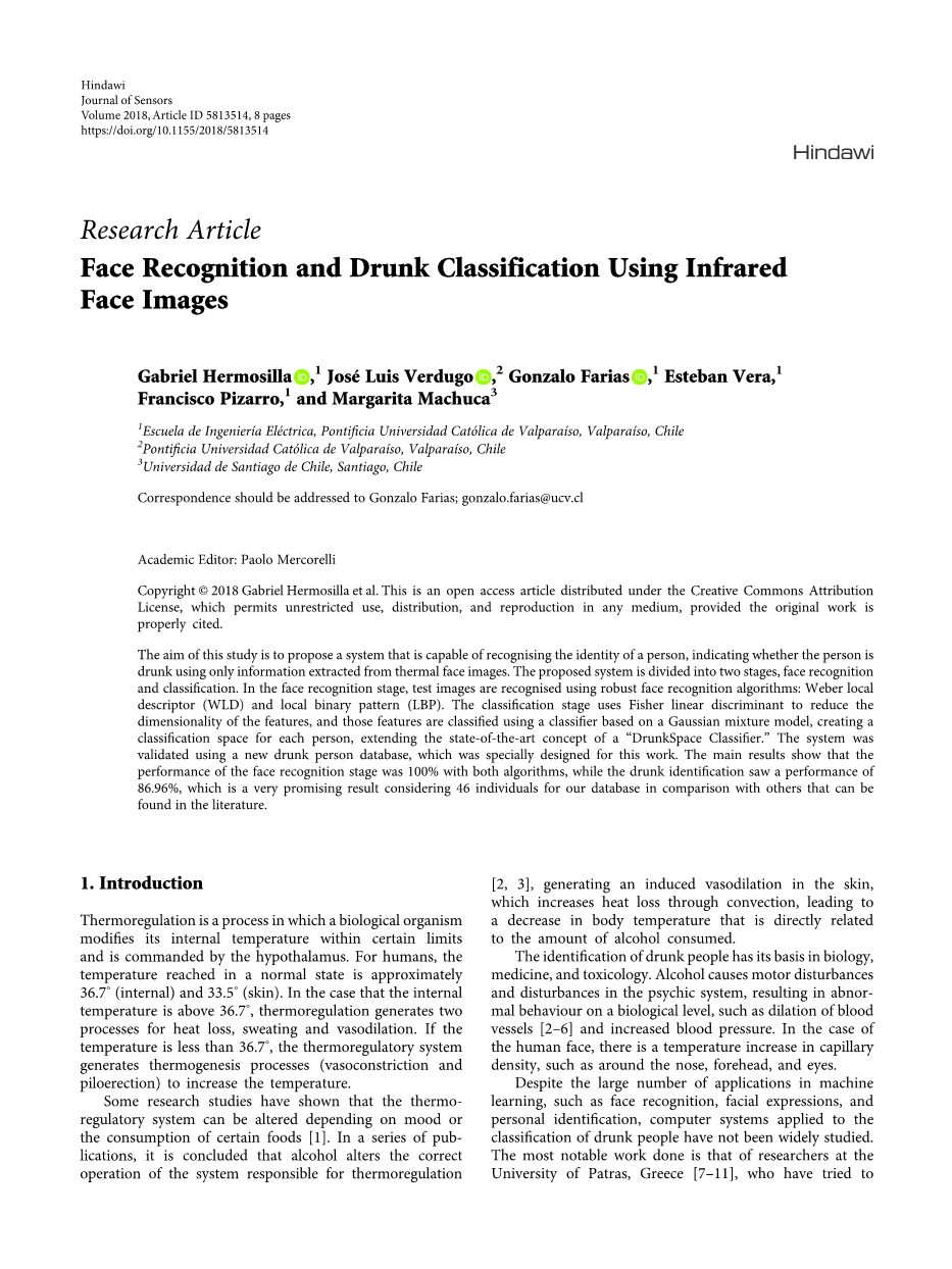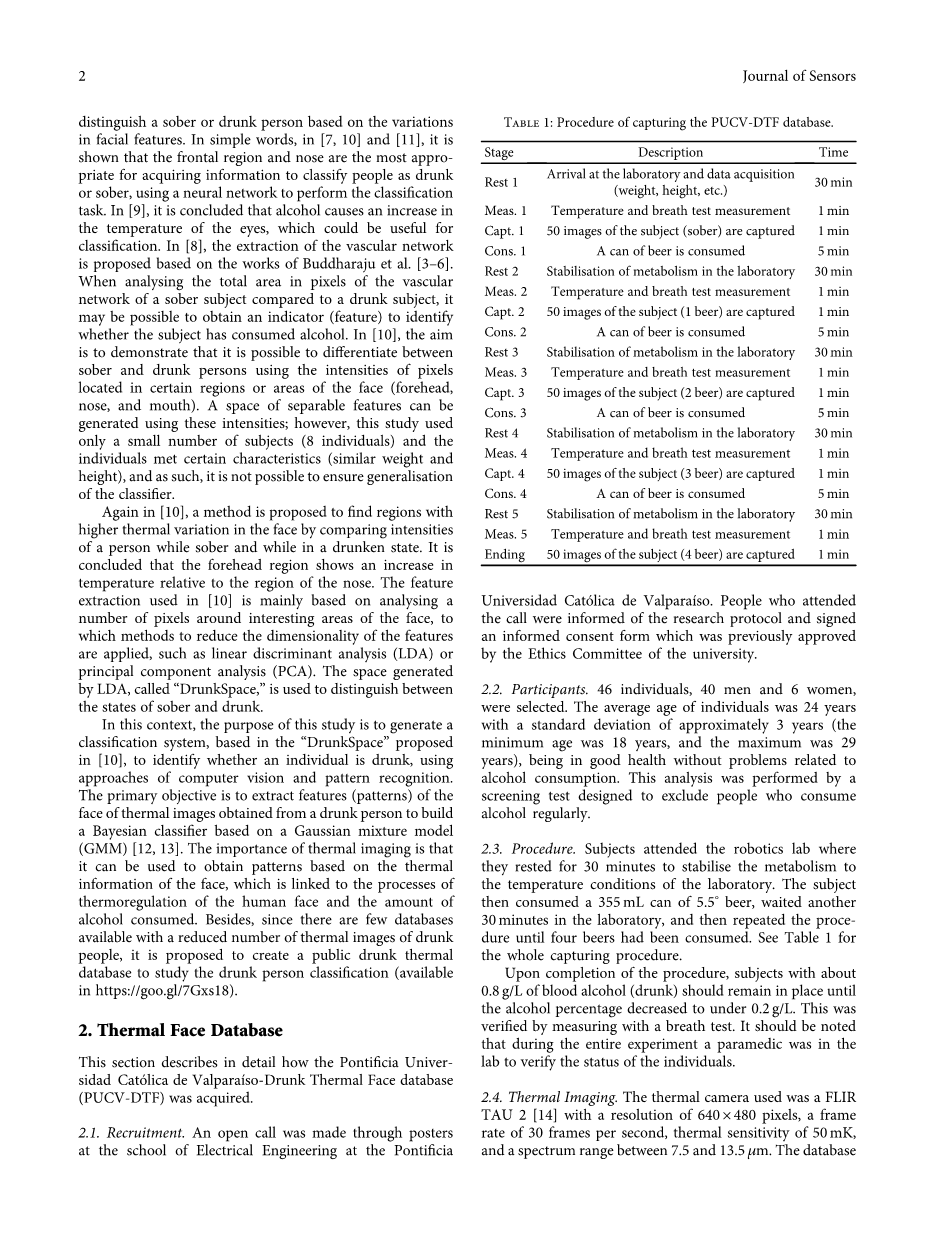 Despite the large number of applications in machine learning, such as face recognition, facial expressions, and personal identification, computer systems applied to the classification of drunk people have not been widely studied. The most notable work done is that of researchers at the University of Patras, Greece [7–11], who have tried to distinguish a sober or drunk person based on the variations in facial features. In simple words, in [7, 10] and [11], it is shown that the frontal region and nose are the most appro-priate for acquiring information to classify people as drunk or sober, using a neural network to perform the classification task. In [9], it is concluded that alcohol causes an increase in the temperature of the eyes, which could be useful for classification. In [8], the extraction of the vascular network is proposed based on the works of Buddharaju et al. [3–6]. When analysing the total area in pixels of the vascular network of a sober subject compared to a drunk subject, it may be possible to obtain an indicator (feature) to identify whether the subject has consumed alcohol. In [10], the aim is to demonstrate that it is possible to differentiate between sober and drunk persons using the intensities of pixels located in certain regions or areas of the face (forehead, nose, and mouth). A space of separable features can be generated using these intensities; however, this study used only a small number of subjects (8 individuals) and the individuals met certain characteristics (similar weight and height), and as such, it is not possible to ensure generalisation of the classifier.