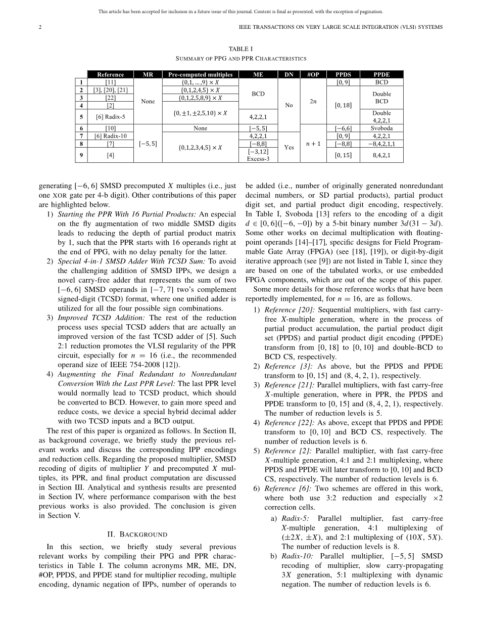 选择可选的IPP表示与PPG无关,这在十进制零运算中具有特别重要的意义:一是IPP的快速、低成本平差,二是它对IPP表示的影响,这对PPR效率影响很大。通过bcd数字逐位乘法实现简单的ppg[8],[9]是慢的,昂贵的,并导致n双-BCD IPPs的ntimes;n乘法(即,2n BCD数被添加)。然而,[10]的工作既能增加乘数,也能使数字签名的数字(SMSD)表示,并使用更有效的3-b-b-PPG。尽管如此,经过长期的实践[11],大多数PPG方案使用预先计算的乘积倍数X(或X倍数)。完备集0,1,...9}乘X作为普通的bcd n的预计算和随后的选择也是缓慢和昂贵的.。一种常见的补救技术是使用一个较小的、成本较低的集合,通过快速无携带操作(例如,0、1、2、4、5}x)可以实现,而代价是将在PPR中添加的BCD数增加一倍;也就是说。生成N个双BCD IPPs,如3X=(2X,X),7X=(5X,2X)或9X=(5X,4X)。我们总结了PPG和PPR在第二节中的几个先前相关工作的特点(表一)。