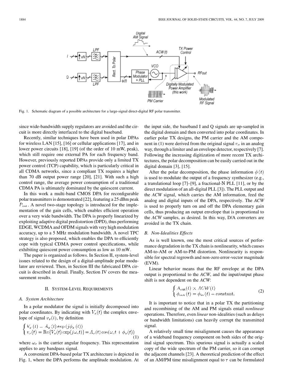 对于上述非理想性因素的处理,在图1中采用了数字密集的极性结构与模拟替代方案相比具有以下优点。首先,数字预失真(DPD)可以直接在数字化的体系结构中引入,以纠正调制非线性[3], [11]。其次,在高度集成的系统中,关键的AM/PM时间对齐方式更容易预测,并且可以在数字域中进行校正[25]。此外,AM调制带宽不受任何模拟包络放大器的限制,也不受供给调制的PA解决方案的限制。最后,数字设计对过程电压温度(PVT)的变化不那么敏感,从而提高了调制精度。
