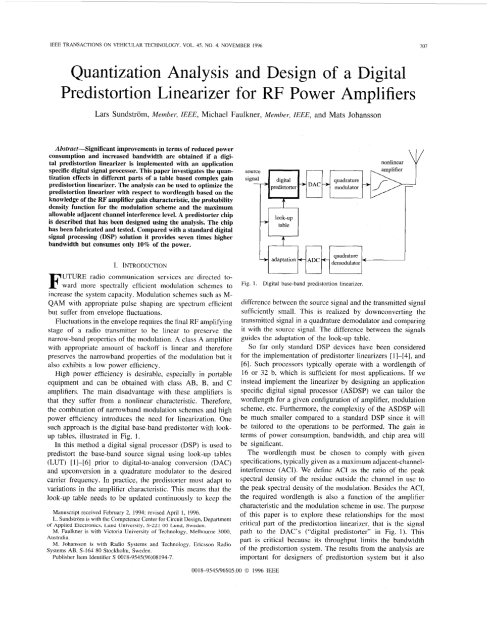 在这种方法中,数字信号处理器(dsp)用于预失真的基带源信号。源信号在数模转换(dac)之前通过查找表(LUT)[1]-[6]获得,并在正交调制器中向上转换到所需的载波频率。在实践中, 预失真器必须适应放大器特性的变化。这意味着查找表需要不断更新, 以保持源信号与传输信号之间的差异足够小。这是通过在正交解调器中向下转换传输信号并与将其与源信号进行比较来实现的。信号之间的差异指导着查找表的适应。