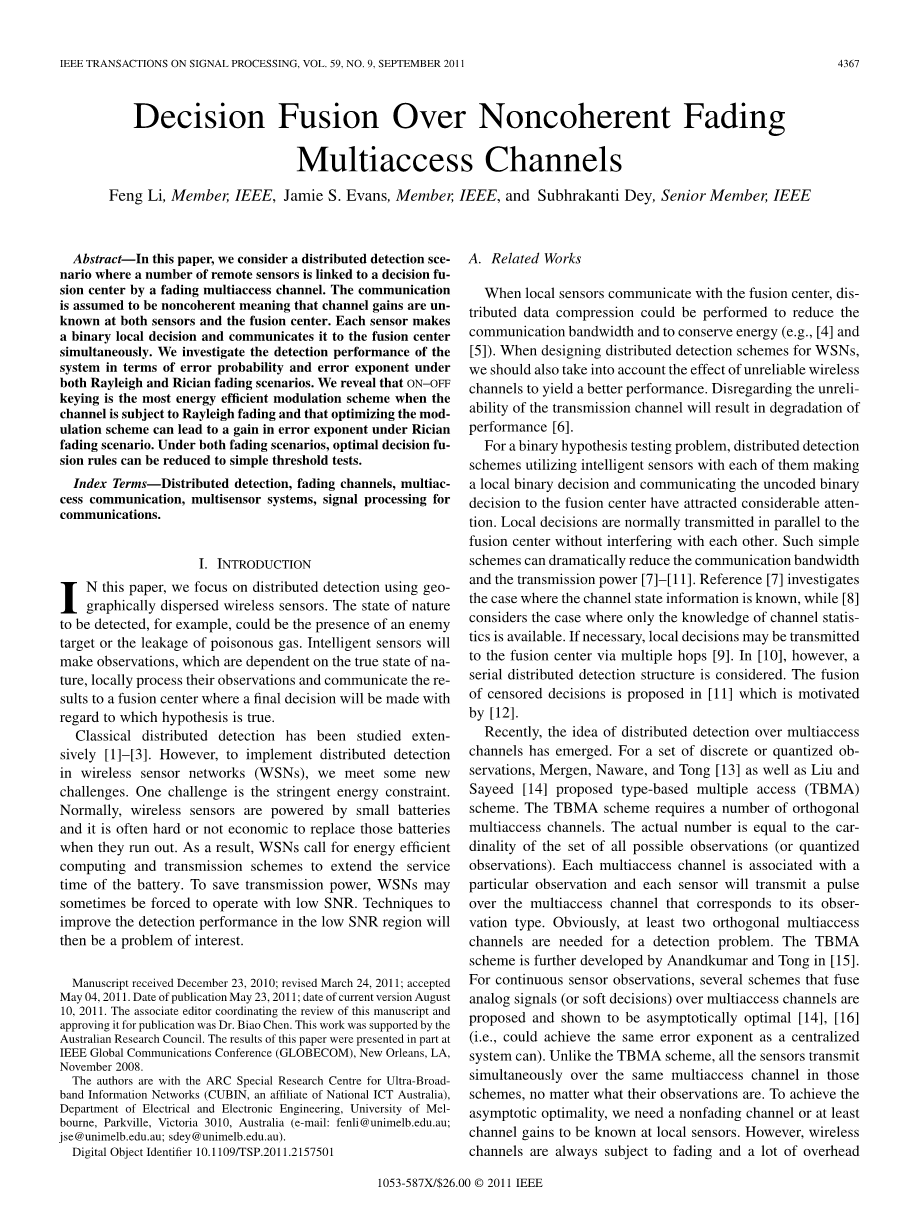 关键词 - 分布式检测,衰落信道,多址通信,多传感器系统,通信信号处理。