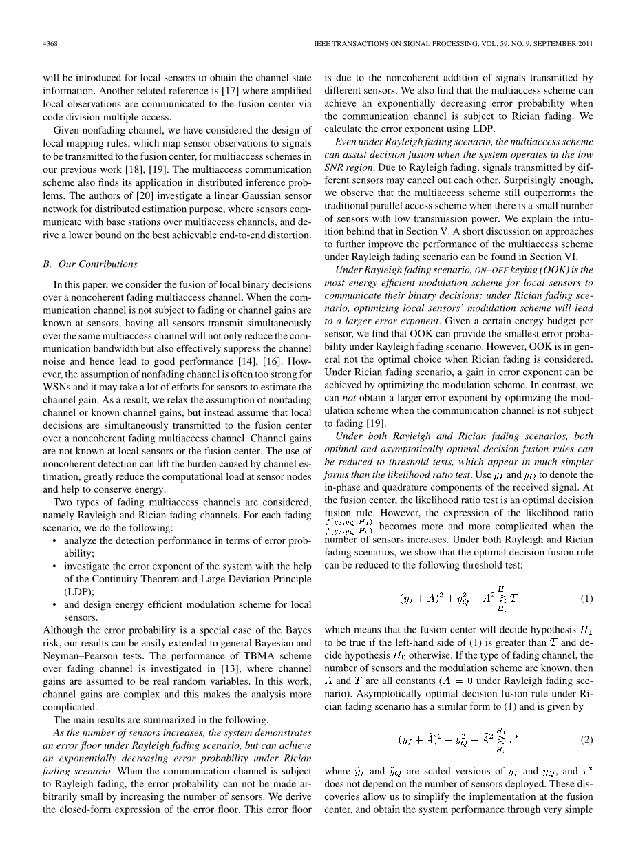 而 ,是由第i个传感器做出的本地决定(表示第k个传感器决定Hi),是独立同分布的复信道增益,n是均值为0和的复高斯噪声。这种模型如图1所示。将考虑两种衰落情景。