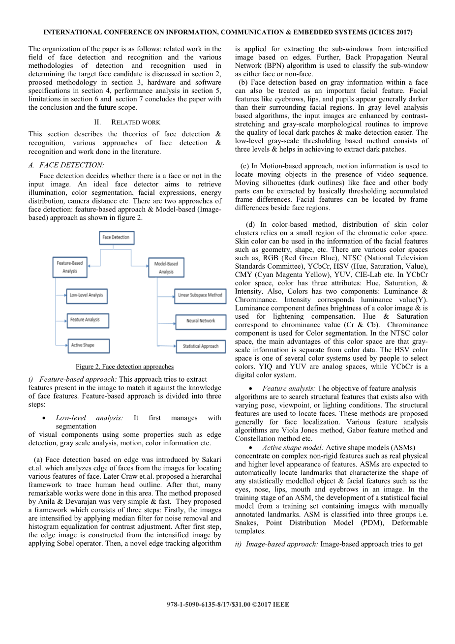 The organization of the paper is as follows: related work in the field of face detection and recognition and the various methodologies of detection and recognition used in determining the target face candidate is discussed in section 2, proosed methodology in section 3, hardware and software specifications in section 4, performance analysis in section 5, limitations in section 6 and section 7 concludes the paper with the conclusion and the future scope.
