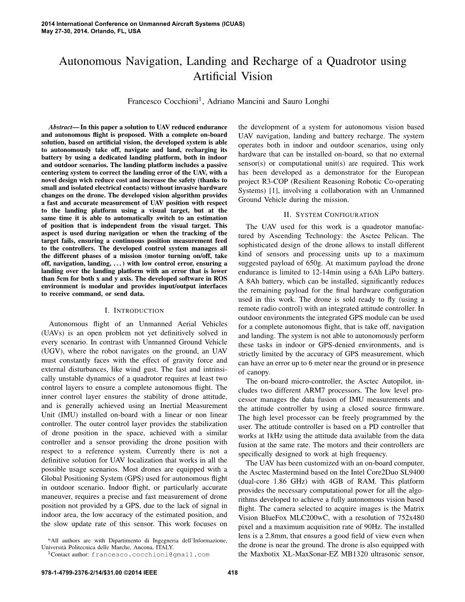 无人机自主飞行是一个尚未完全解决并且涉及广的问题。与在地面上导航的无人地面飞行器(UGV)相比,无人机要不断地面对重力和外部干扰的影响,如阵风。四象限飞行器因为运动速度快和不稳定的本质,使其至少两个控制层以确保完全的自主飞行。内部控制层确保无人机姿态的稳定性,他们通常使用安装在机上的带有线性或非线性控制器的惯性测量单元(IMU)来实现。外部控制层保证了无人机在空间中的位置的稳定,通过利用类似的控制器和传感器提供无人机相对于参考系统的位置。针对在任何场景下的无人机定位,目前没有一个确定性的解决方案。大多数无人驾驶飞机配备了用于室外场景自主飞行的全球定位系统(GPS)。由于室内区域缺乏信号,估计位置的精度低,以及该传感器的更新速度慢,所以对于室内飞行或者特别精确的机动,无人机需要对没有GPS的无人机的位置进行精确而快速的测量。这项工作的重点是基于自主视觉的无人机导航、着陆和蓄电池补给系统的研制。该系统能在室内和室外情况下都工作,由于只使用可以安装在机上的硬件,因此不需要外部传感器或计算单元。这项工作已经成为欧洲R3-COP(弹性推理机器人协作系统)[1]项目的示范项目,其中涉及在任务期间与无人地面车辆进行协作。