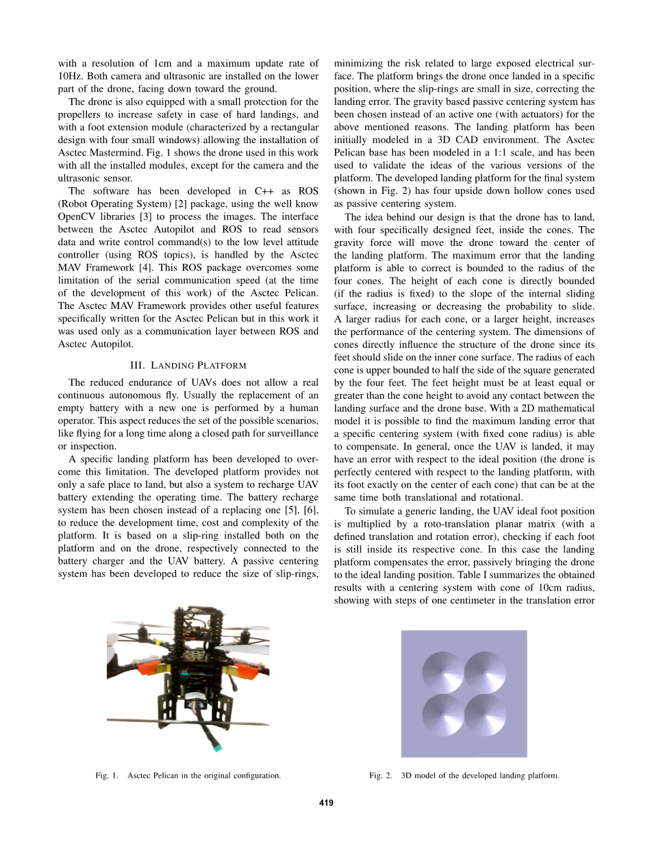 为了克服这个限制,我们已经开发了一个特定的着陆平台。该平台不仅为无人机着陆提供了安全场所,而且为延长无人机电池工作时间提供了充电系统。为了减少平台的开发时间、成本和复杂性,我们选择了电池充电系统而不是替换电池[5][6]。电池充电系统基于安装在平台上和无人机上的滑环,分别连接到电池充电器和无人机电池。为了减小滑环的尺寸,从而最大限度地减少与暴露的大电气表面有关的风险,我们开发了一种被动定心系统。平台上滑环尺寸小,可用于纠正着陆误差,使无人机降落在一个特定的位置。基于上述原因,我们选择了没有选择主动定心系统(带有致动器),而是选择了基于重力的无源定心系统。我们已经在3D CAD环境中对着陆平台进行了初步建模。Asctec Pelican基地已经以1:1的比例进行了建模,并已用于验证平台的各种版本的想法。为最终系统(如图2所示)开发的着陆平台具有四个倒置的空心锥体,用作被动对中系统。