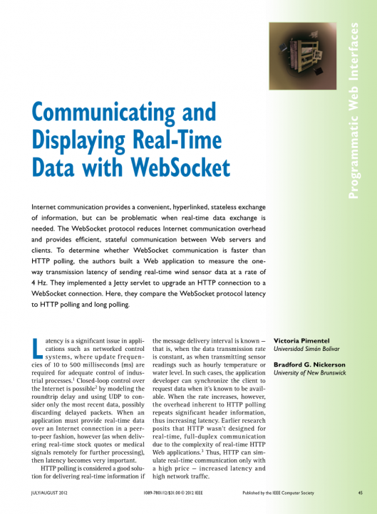 延迟是网络控制系统等应用程序中的一个重要问题,在网络控制系统中,需要10到500毫秒(ms)的更新频率来充分控制工业过程。1通过模拟往返延迟并使用UDP仅考虑最新数据(可能是discar)2,可以在Internet上进行闭环控制。叮当延迟的包。然而,当应用程序必须以对等方式通过互联网连接提供实时数据时(如远程传递实时股票报价或医疗信号以进行进一步处理),延迟变得非常重要。如果消息传递间隔是已知的——也就是说,当数据传输速率恒定时,例如在传输传感器读数(如小时温度或水位)时。在这种情况下,应用程序开发人员可以同步客户机以在已知可用时请求数据。但是,当速率增加时,HTTP轮询固有的开销会重复重要的头信息,从而增加延迟。早期的研究认为,由于实时HTTP Web应用程序的复杂性,HTTP不是为实时、全双工通信而设计的。3因此,HTTP只能在高价格增加延迟和高网络流量的情况下模拟实时通信。