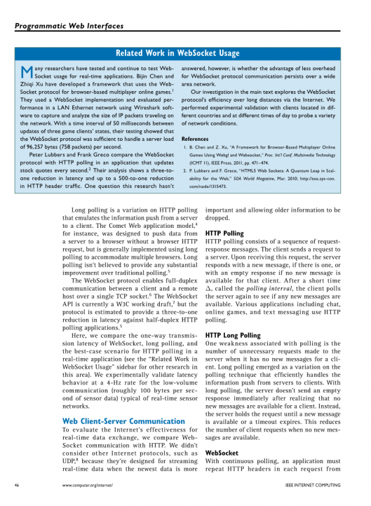 许多研究人员已经测试并继续测试实时应用程序中WebSocket的使用情况。陈碧金和徐志奇开发了一个框架,将WebSocket协议用于基于浏览器的多人在线游戏。1他们使用WebSocket实现,并使用Wireshark软件评估局域网中的性能,以捕获和分析网络上传输的IP包的大小。三个游戏客户端状态更新之间的时间间隔为50毫秒,测试表明WebSocket协议足以处理每秒96257字节(758个数据包)的服务器负载。Peter Lubbers和Frank Greco在一个每秒更新股票报价的应用程序中比较了WebSocket协议和HTTP轮询。2他们的分析显示,延迟减少了三对一,HTTP头流量减少了500对一。这项研究还没有发现一个问题