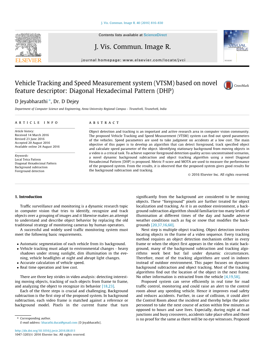 目标检测和跟踪是计算机视觉领域中一个重要和活跃的研究领域。提出的车辆跟踪和速度测量(VTSM)系统可以测出车辆的速度参数。 速度参数用于以低成本对事故进行判断。 本文的主要目标是开发一种算法,可以检测前景,跟踪指定对象并计算对象的速度参数。 从视频中的移动对象中识别静态背景是一项关键任务。为了在不受约束的场景中实现更优秀的前景检测质量,提出了一种新颖的动态背景扣除和对象跟踪算法,该算法使用了一种新的对角十六进制模式(DHP)。使用公制F-score和MOTA来衡量所提出的系统的性能。从结果中可以看出,所提出的系统为背景扣除和跟踪提供了良好的结果。