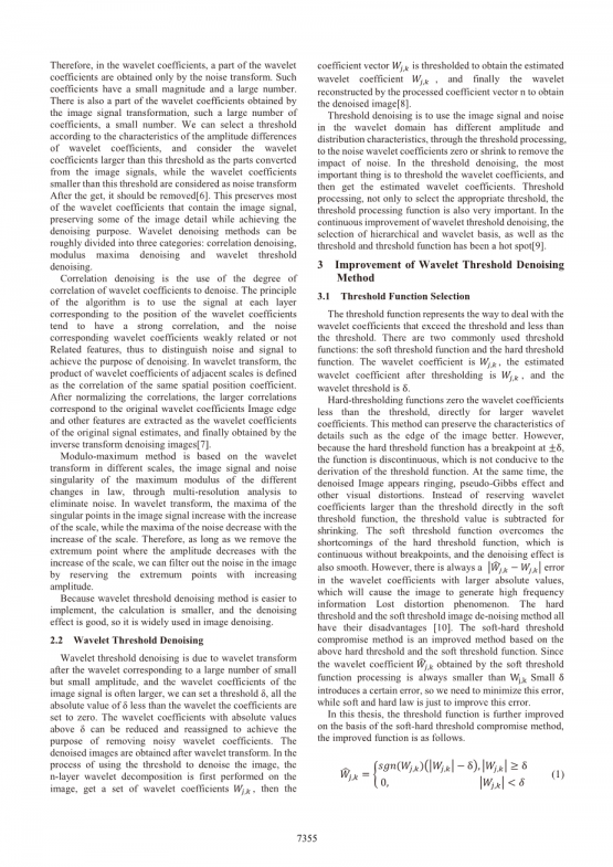 硬阈值函数使小波系数归零小于阈值,直接用于较大的小波系数。这种方法可以保留特征细节如图像的边缘更好。然而,因为硬阈值函数在。处有一个断点,功能是不连续的,这是不利于的推导阈值函数。与此同时,去噪图像出现响铃,伪吉布斯效应和其他视觉扭曲。而不是保留小波直接在软件中大于阈值的系数阈值函数,减去阈值萎缩。软阈值功能克服了硬阈值功能的缺点,即连续没有断点,去噪效果也顺利。但是,始终存在错误在具有较大绝对值的小波系数中,这将导致图像产生高频率信息丢失失真现象。很难阈值和软阈值图像去噪方法全部它们的缺点[10]。软硬门折衷方法是一种基于改进的方法高于硬阈值和软阈值功能。以来通过软阈值获得的小波系数功能处理总是小于,引入了一定的错误,所以我们需要尽量减少这个错误,虽然软法和硬法只是为了改善这个错误。