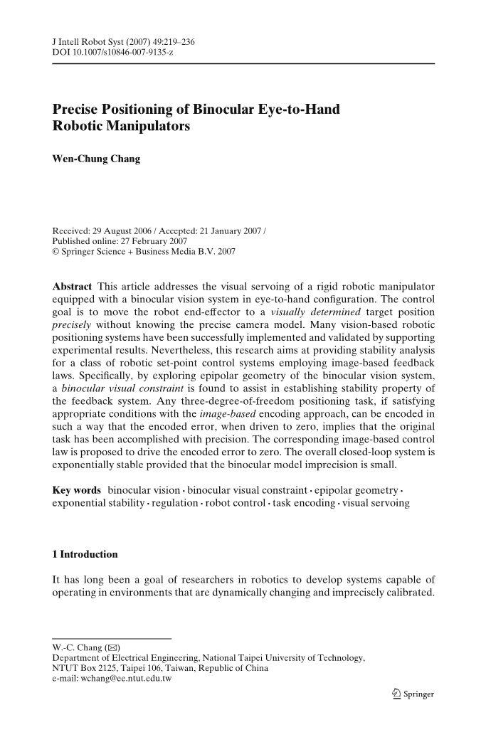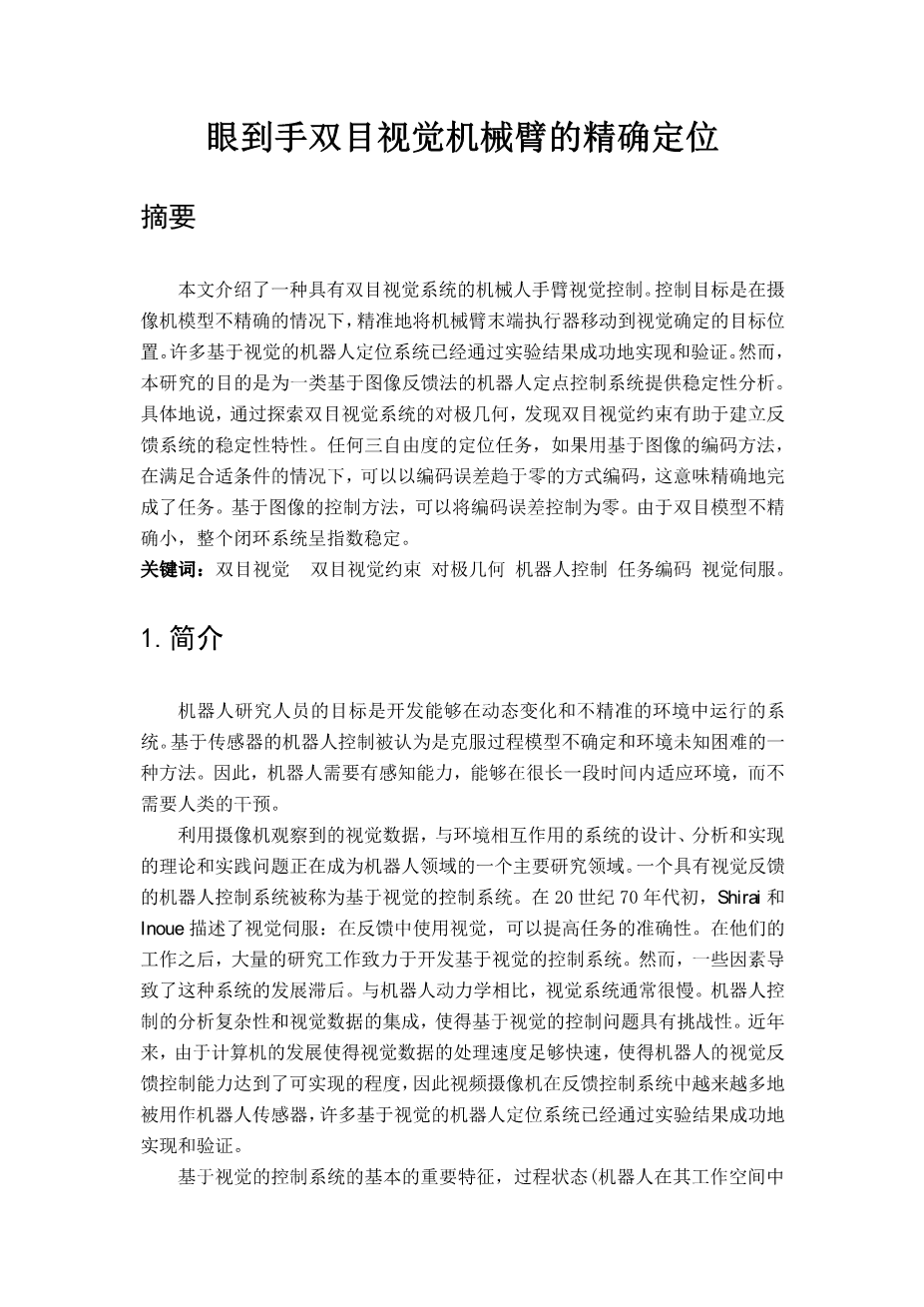 基于双目视觉定位技术的机械臂的设计与研究外文翻译资料 2022-05-27 22:40:56 英语原文共 18 页,剩余内容已隐藏,支付完成后下载完整资料 英语原文共 10 页,剩余内容已隐藏,支付完成后下载完整资料资料编号:[11687],资料为PDF文档或Word文档,PDF文档可免费转换为Word 原文和译文剩余内容已隐藏,您需要先支付 30元 才能查看原文和译文全部内容!立即支付 发小红书推广免费获取该资料资格。点击链接进入获取推广文案即可: Ai一键组稿 | 降AI率 | 降重复率 | 论文一键排版 PREVIOUS NEXT 您可能感兴趣的文章 带有Mini-LED背光的高动态范围液晶显示器外文翻译资料 基于局部直方图均衡的分层曝光无伪影高动态范围成像外文翻译资料 深入了解卷积外文翻译资料 基于局部和全局强度信息的主动轮廓模型用于医学图像分割外文翻译资料 采用叠加场效应管结构的毫米波功率放大器的分析与设计外文翻译资料 用于宽带包络跟踪的动态堆叠控制CMOS射频功率放大器外文翻译资料 文本无关说话人识别综述:从特征到超向量外文翻译资料 用SIMULINK启动外文翻译资料 AlGaN/GaN HEMT中电子迁移率与欧姆接触宽度关系的研究外文翻译资料 基于物联网的实时二氧化碳监测云技术外文翻译资料