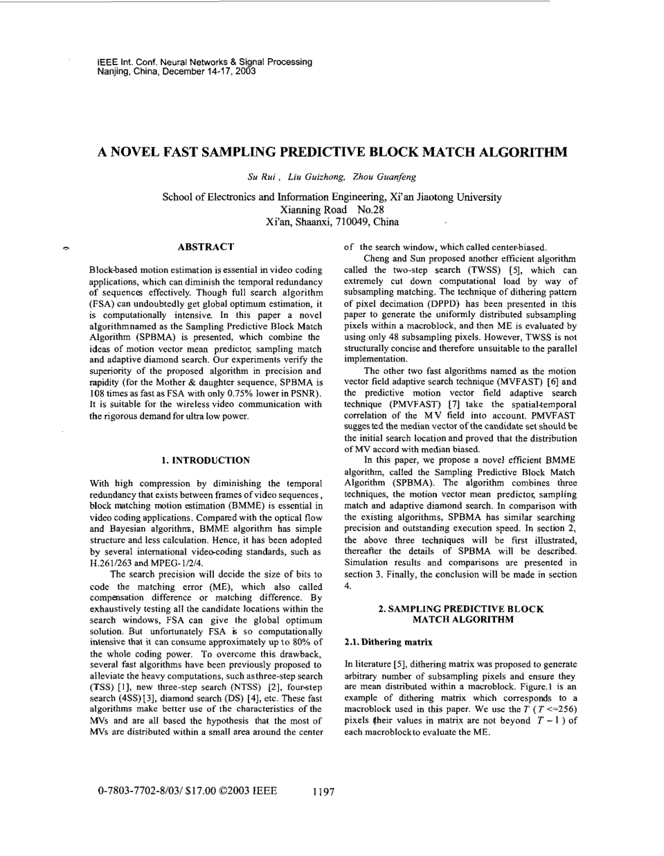 本文提出了一种新的有效的块匹配运动估计算法, 称为采样预测块匹配算法 (SPBMA)。该算法结合三技术, 运动矢量均值预测采样匹配和自适应菱形搜索。与现有算法相比, 采样预测块匹配算法具有相似的搜索精度和出色的执行速度。在第2节中,