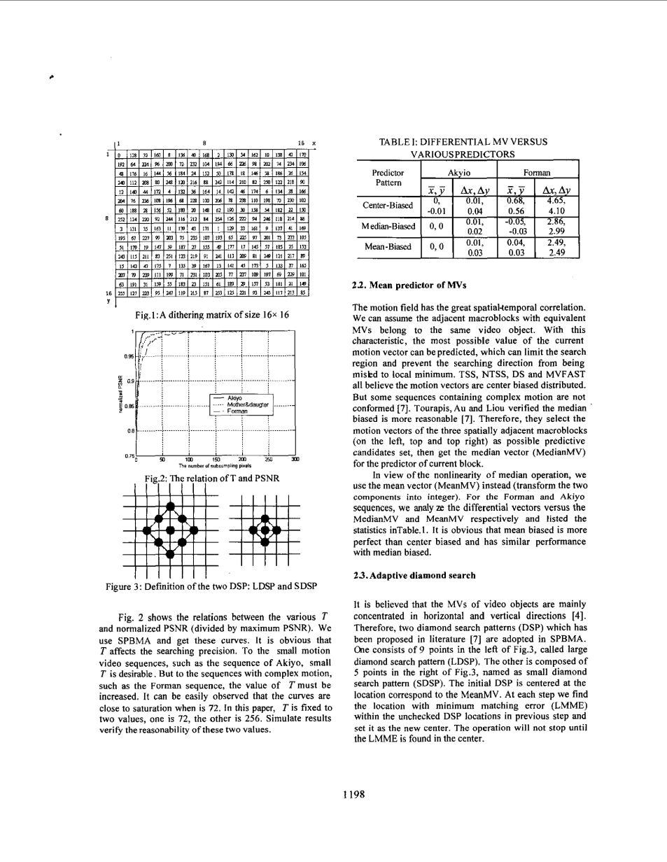 在文献中, 提出了抖动矩阵来生成任意数量的抽样像素, 并确保它们在宏块中是平均分布的。图1是一个与本文所使用的宏块相对应的抖动矩阵的例子。我们使用 t (t = 256) 像素 (他们的矩阵值不超过T-1) 每个宏块来评估全搜索法。