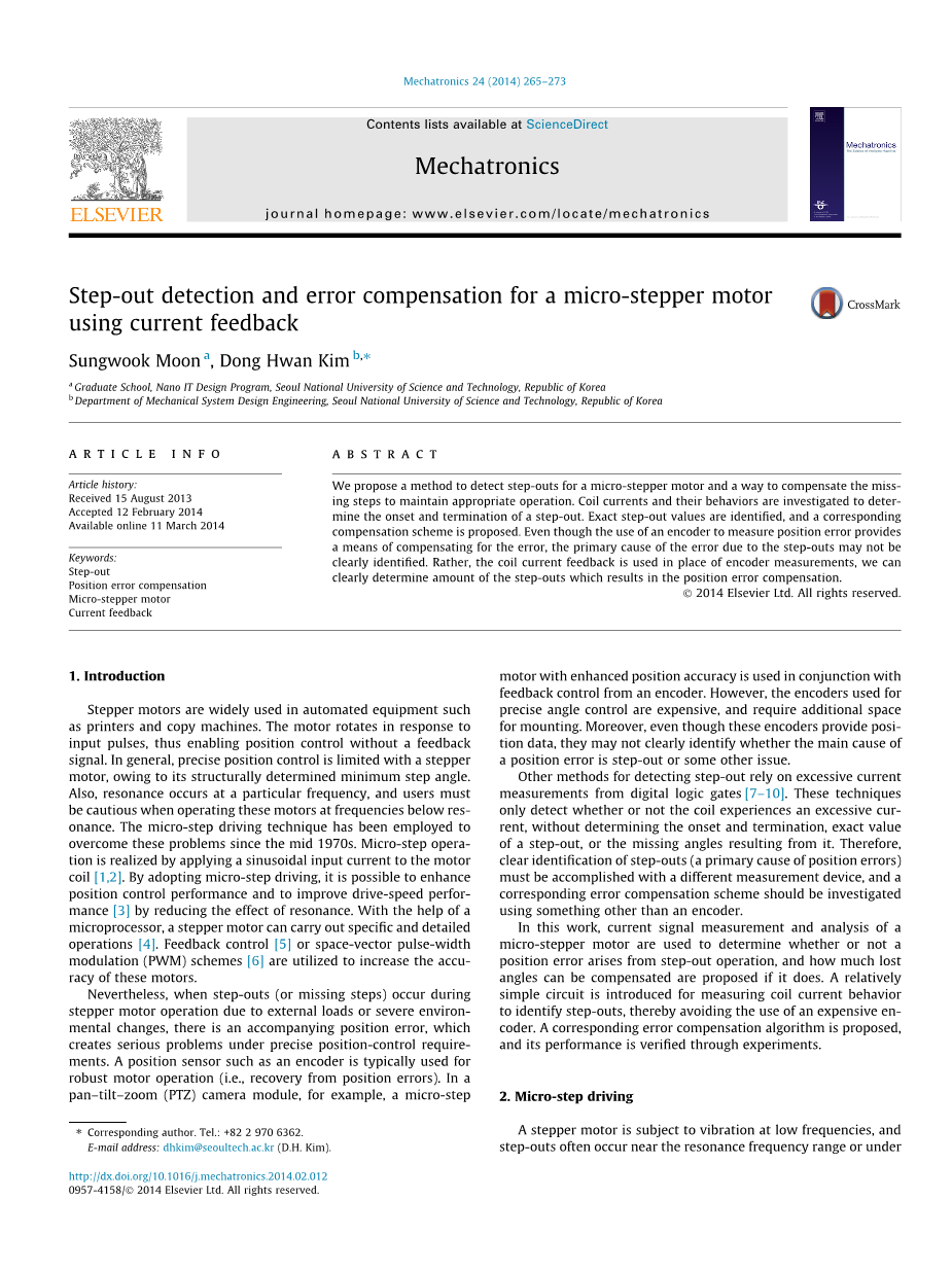 在这一工作中,电流信号测量和微型步进电机的分析决定了位置误差的出现是否是因为丢步操作,如果是的话,那么需要补偿多少丢失的角度。一个相对简单的电子回路被用于测量线圈电流的流动,进而去证实丢步,并避免使用昂贵的译码器。一个相对应的误差补偿算法被设定,并通过实验对其变现进行核实。