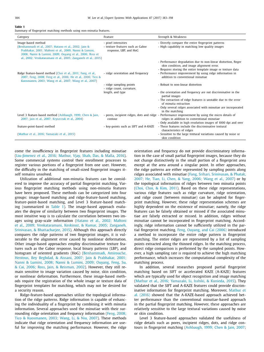 另外,有几项研究提出了局部指纹,基于SIFT或加速KAZE(A-KAZE)特征的匹配,这些特征通常用于物体识别和图像匹配。他们验证了SIFT和A-KAZE特征可以提供歧视-原指纹匹配的原始信息。此外,Mathur等人(2016)显示,基于A-KAZE的方法实现了bet- 性能优于传统的基于细节点的方法在指纹匹配中的应用。然而,这些方法对由噪音或皮肤状况引起的大的结构变化相对敏感。