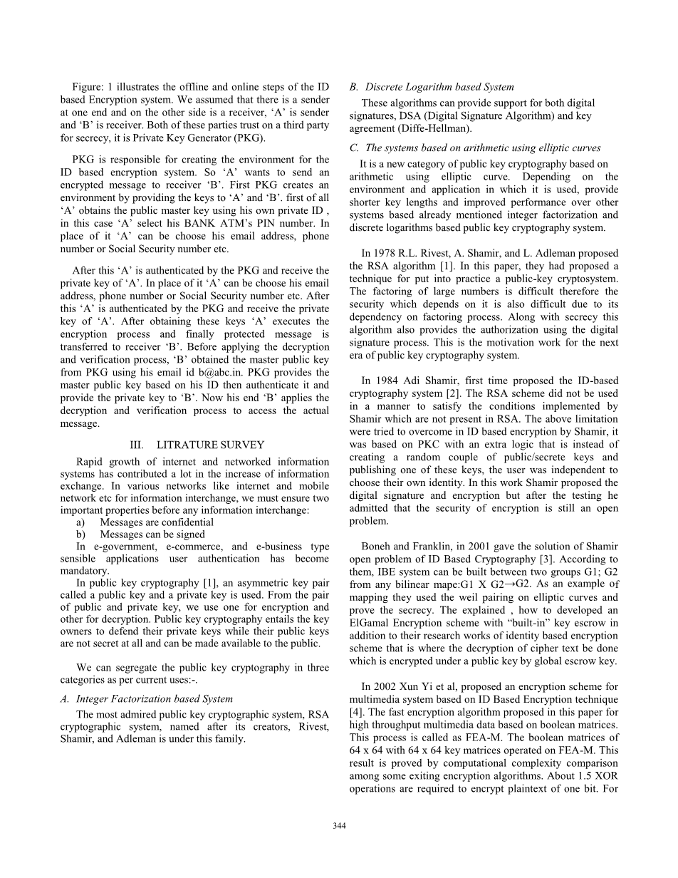 1984年,Adi Shamir首次提出基于身份的密码系统。RSA方案没有被用于满足shamir实施的条件,这些条件在RSA中并不存在。通过shamir尝试在基于id的加密中克服上述限制,它是基于PKC的额外逻辑,而不是创建一对公共/秘密密钥并发布其中一个密钥,用户可以独立选择自己的身份。在这项工作中,沙米尔提出了数字签名和加密,但在测试之后,他承认加密的安全性仍然是一个悬而未决的问题。