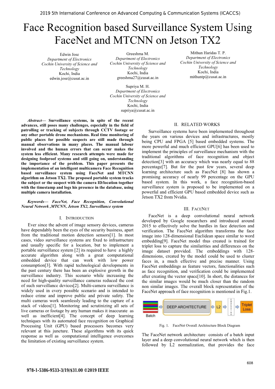 关键词— FaceNet, 人脸识别, 卷积神经网络 ,MTCNN, Jetson TX2, 监控系统