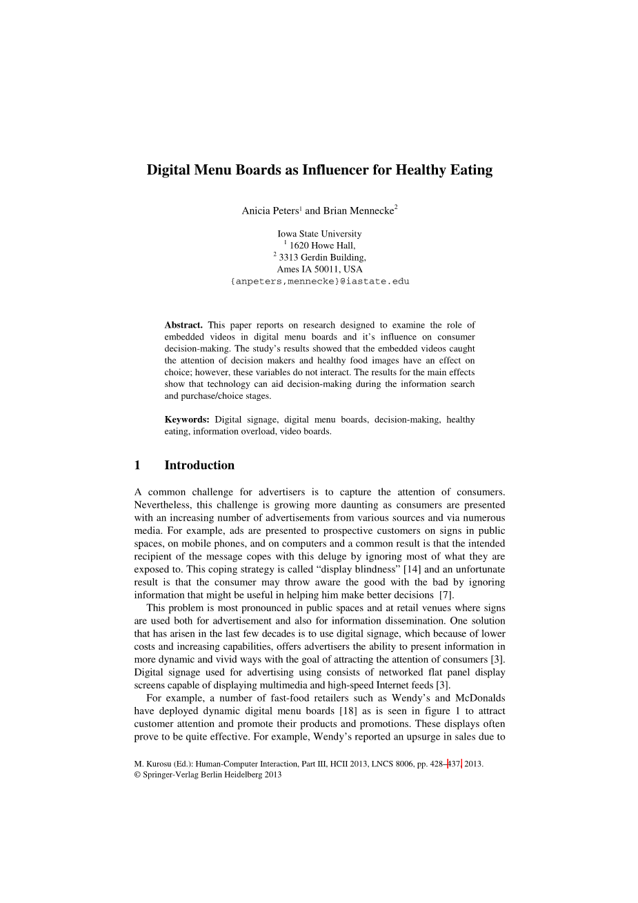 数字菜单显示提供了鼓励健康饮食的潜力。例如,数字菜单可以用来显示
