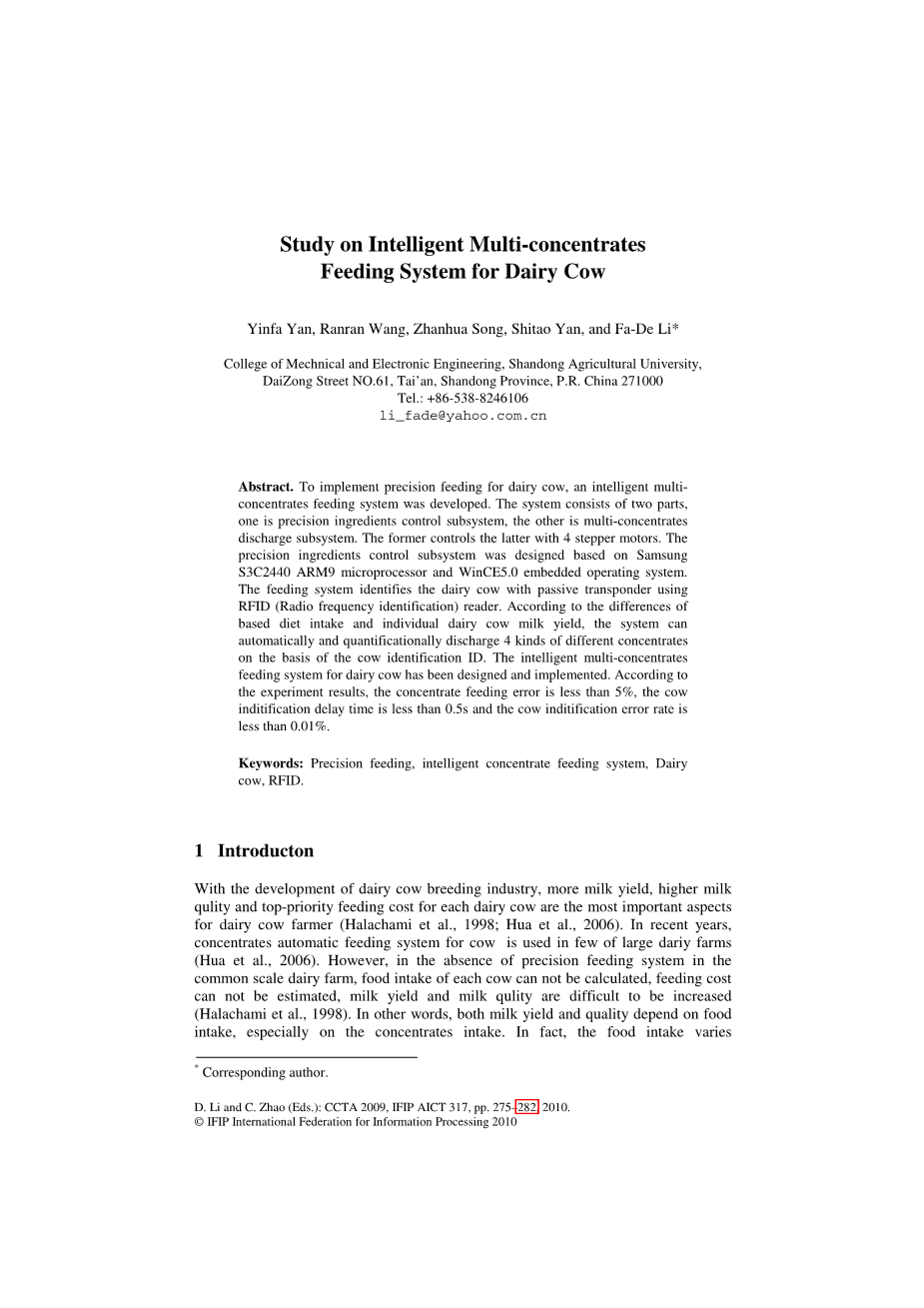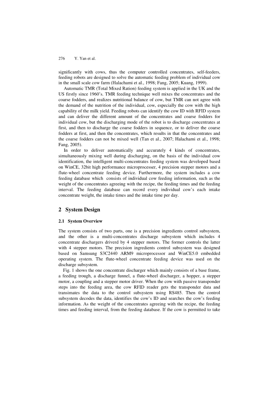为了实现奶牛的精确饲喂,一种智能多精料喂养系统被开发出来。该系统由两部分组成,一个是精密配料控制子系统,另一个是多精料释放子系统。前者通过4个步进电机控制后者。精密配料控制子系统是基于三星设计的S3C2440 ARM9微处理器和WinCE5.0嵌入式操作系统。 饲喂系统通过无源应答器使用RFID(射频识别)读取器识别奶牛。根据饮食的摄入量和个体奶牛的牛奶产量的差异,系统可以自动定量地根据奶牛ID排出4种不同的精料。奶牛的智能多精料喂养系统已经被设计并用于实际生产生活中。根据实验结果,精料喂养误差小于5%,奶牛授精延迟时间小于0.5s,奶授失误率小于0.01%。