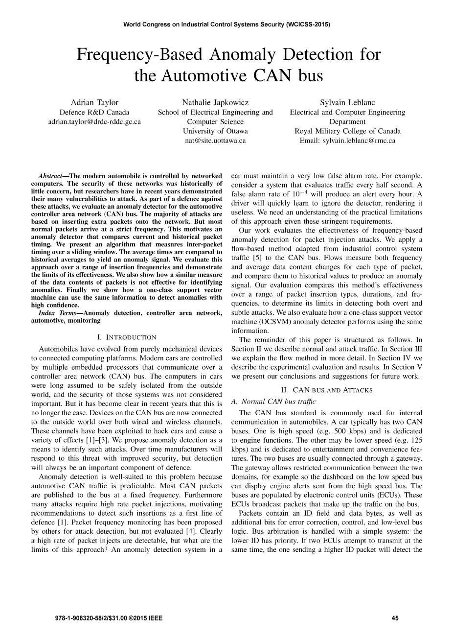 Index Terms:Anomaly detection, controller area network, automotive, monitoring