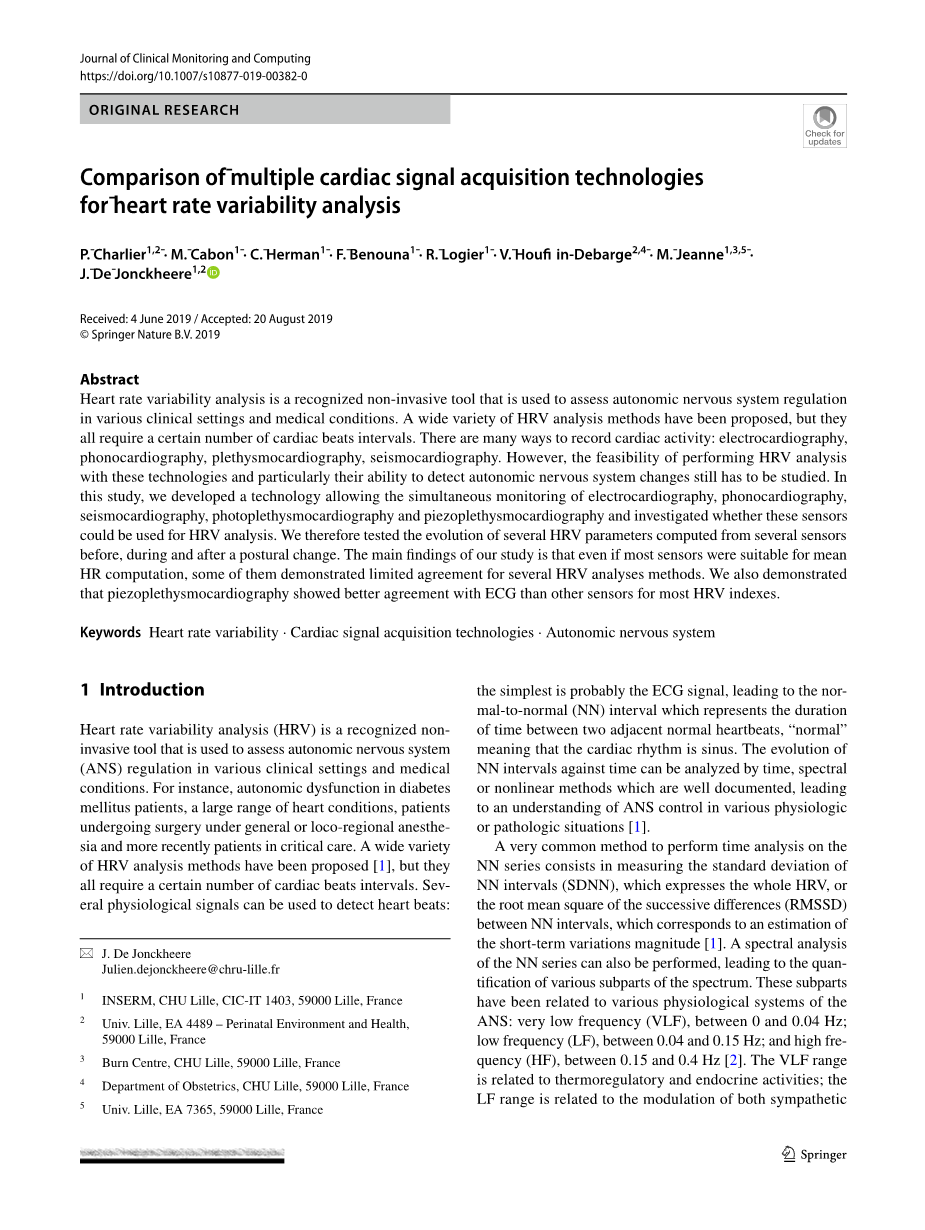 HRV分析显示了在许多临床背景中的相关性,如急性心肌梗死、糖尿病神经病变、癫痫、麻醉、重症监护、新生儿重症监护病房。HRV应用的多重性(临床监测、情绪评价、运动)、人群(成人、儿童、新生儿)和环境(医院、家庭、日常生活等)要求使技术解决方案适应可能引起的使用环境,特别是心脏信号采集技术的选择。