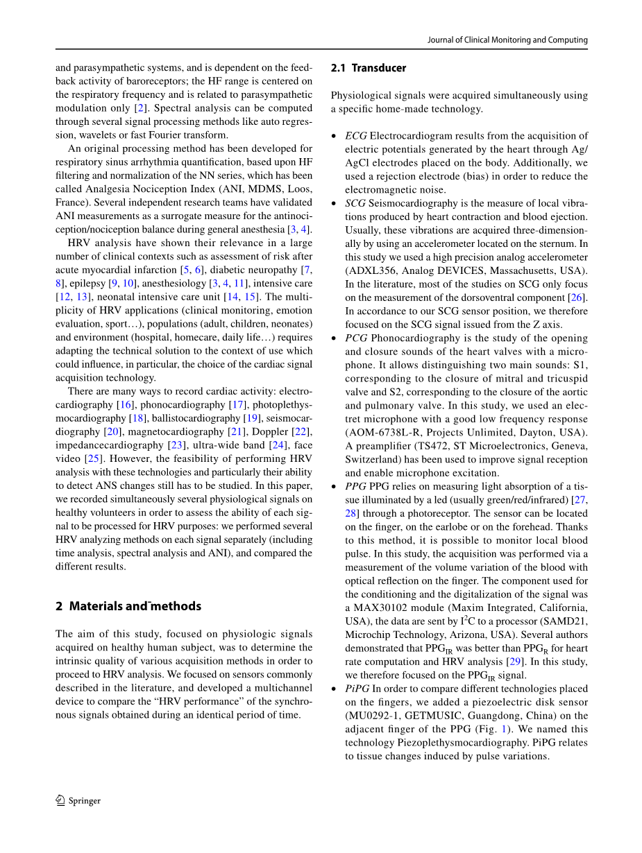 本实验研究了能记录心脏收缩相关生理信号的六种传感器技术是否能为20名健康志愿者的HRV分析提供类似质量的NN系列。发现SCG和PCG比其他传感器更难检测心跳。关于HRV分析,PCG发布的NN系列导致HRV测量结果显示相关性低,与ECG的HRV测量结果一致。其他测试的传感器显示出可接受的时域性能(HR、SDNN和RMSSD)以及频谱低频测量,但频谱高频性能较低(HF和HFn.u)。)测量。有趣的是,ANI计算是全麻期间抗/伤害平衡的替代指标,其结果与金标准心电信号类似。PPG和PIPG传感器最好地检测到姿势改变,因为其与金标准信号通过三个时间测量点获得的变化更符合。